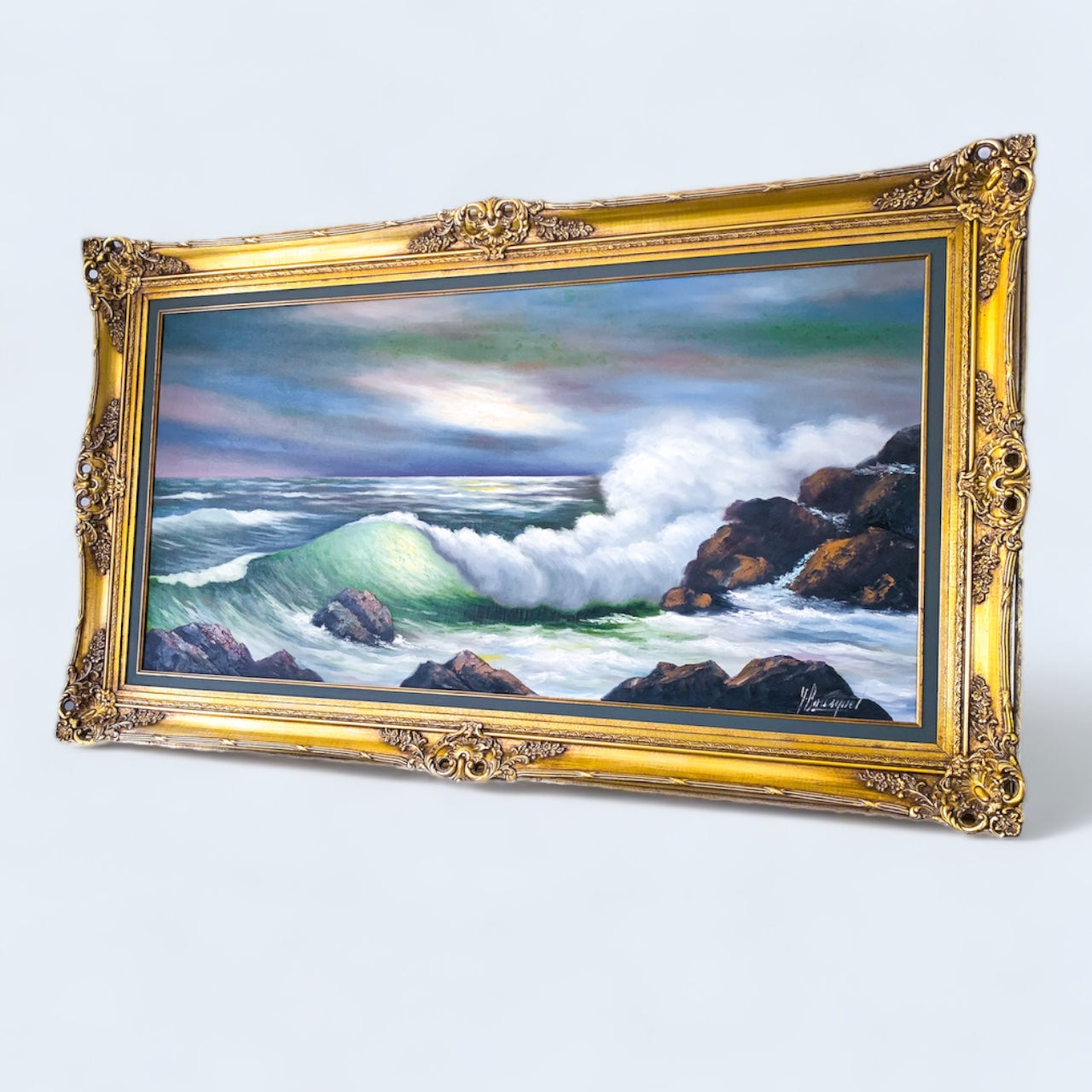 Large Vintage Ocean Oil Painting with Baroque Wood Gold Frame *Signed*