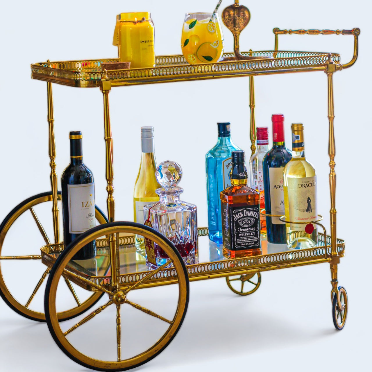 This rare 1970s' Italian Gold Vintage Bar Cart is the perfect statement piece for any discerning collector. Crafted with a luxurious golden hue, this exceptional item is sure to be high in demand due to its timeless quality and artful design. Make this special piece part of your collection today.