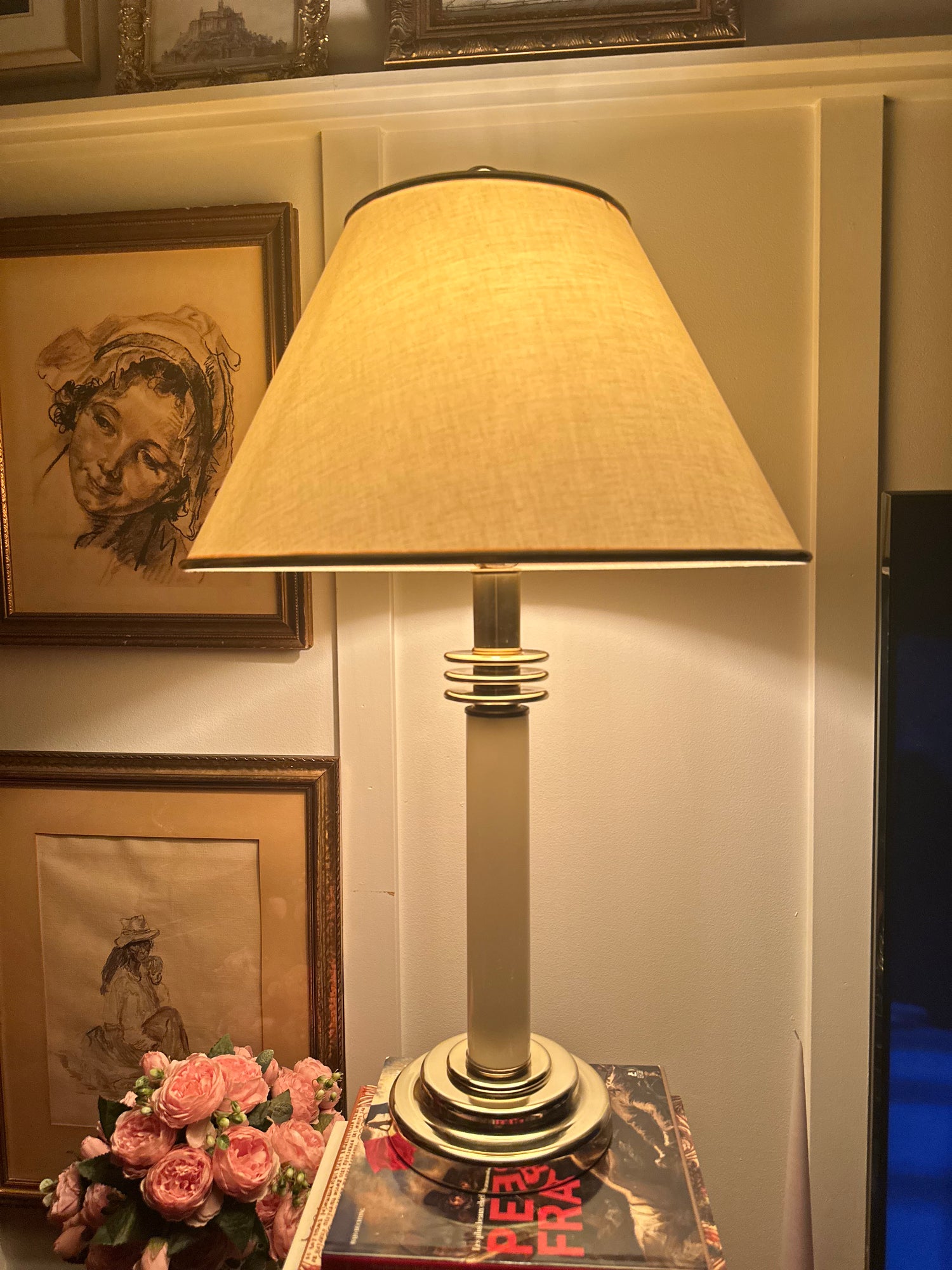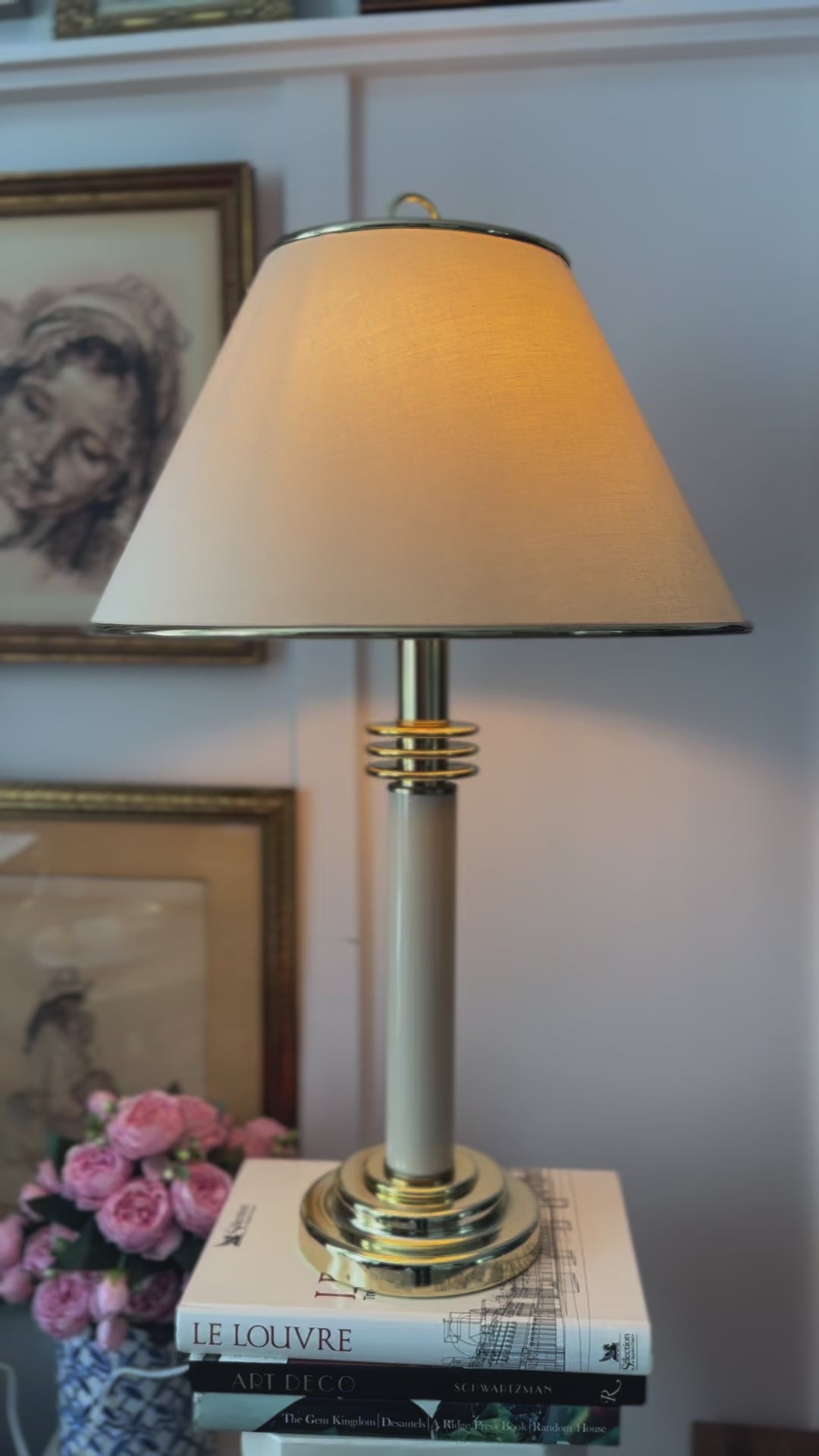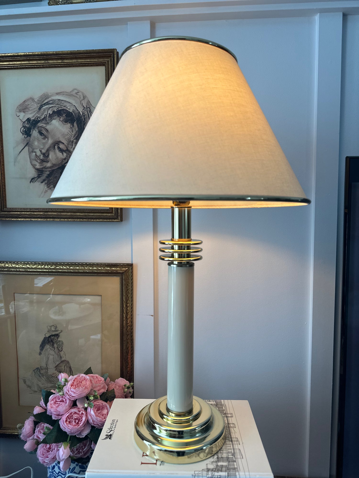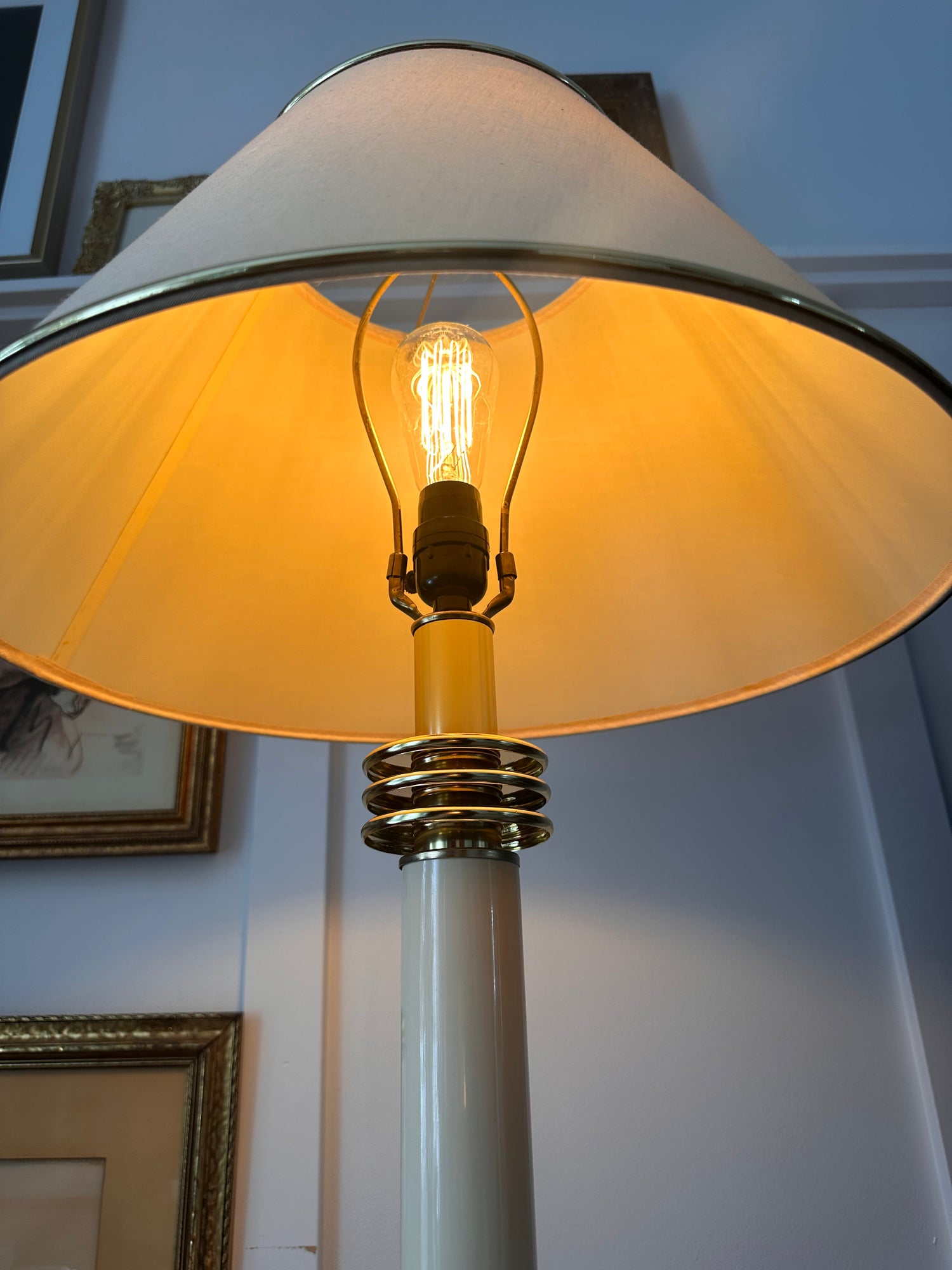 - Original lampshade: Features its characteristic gold rings, perfectly matching the base