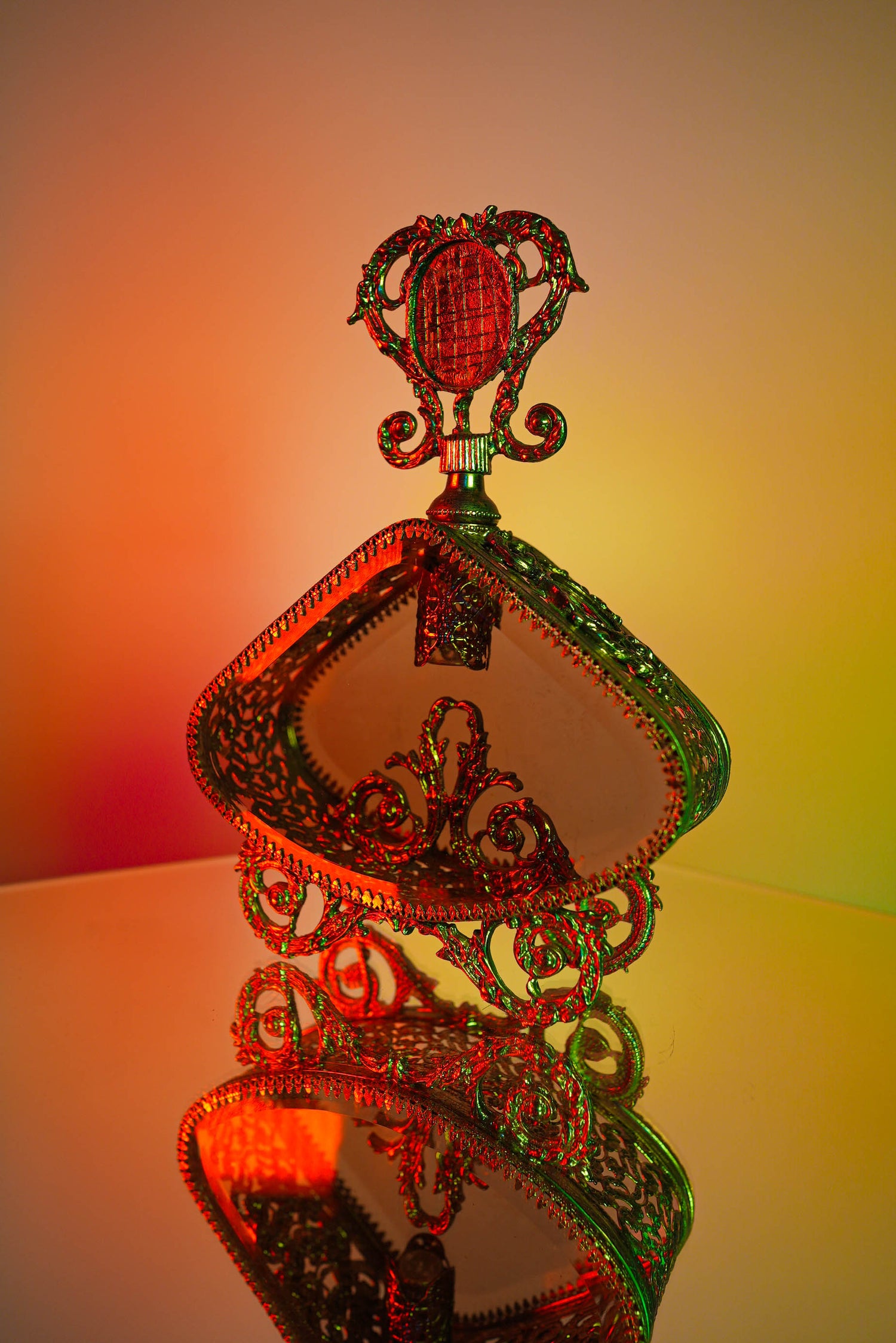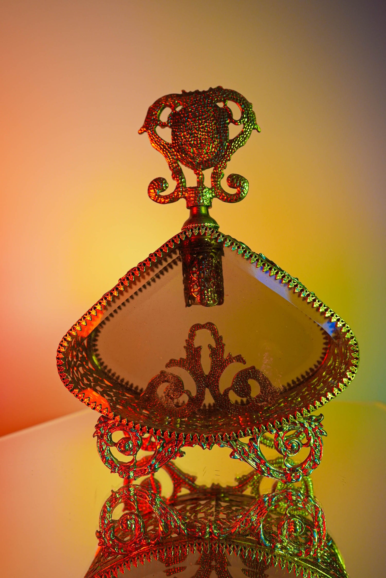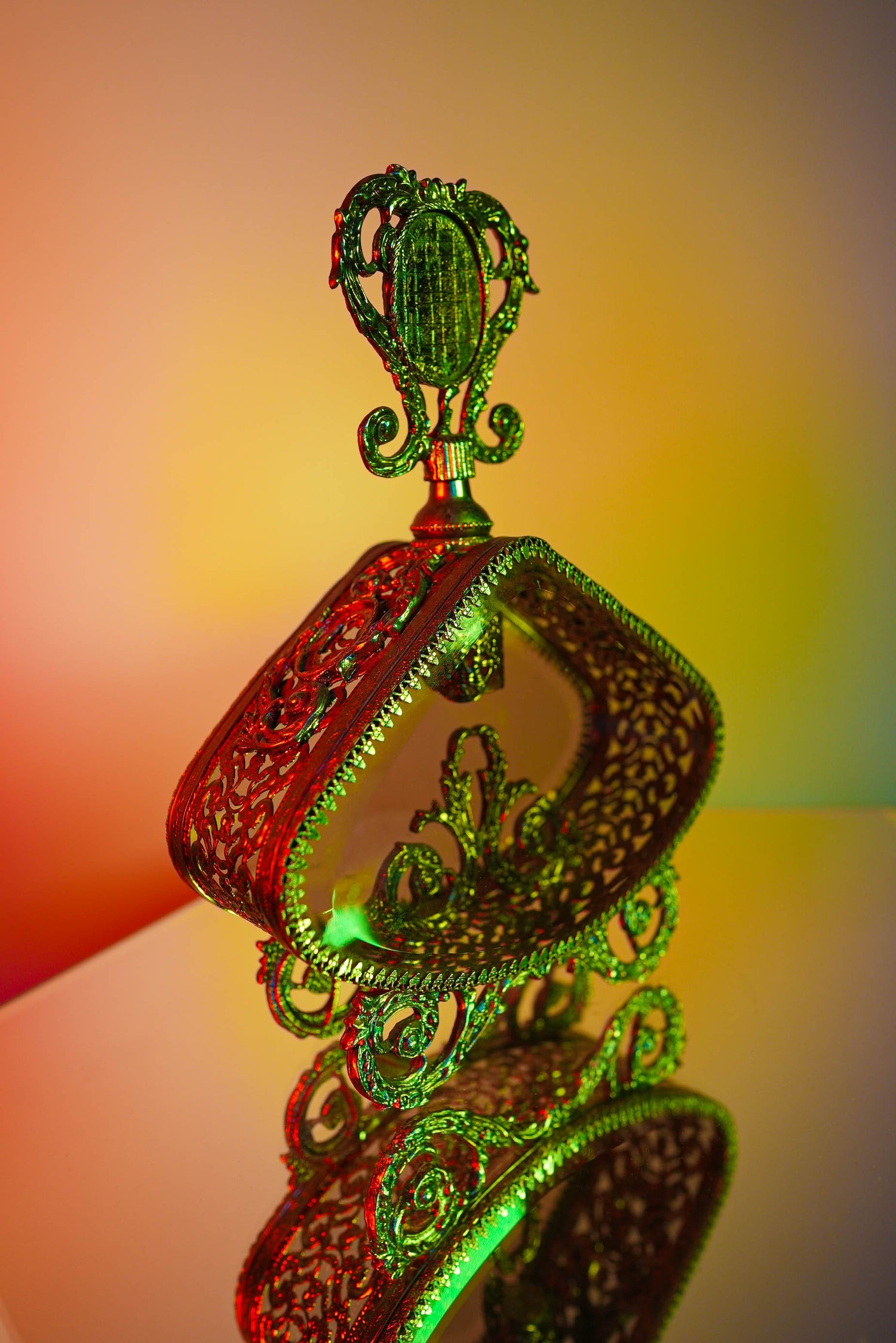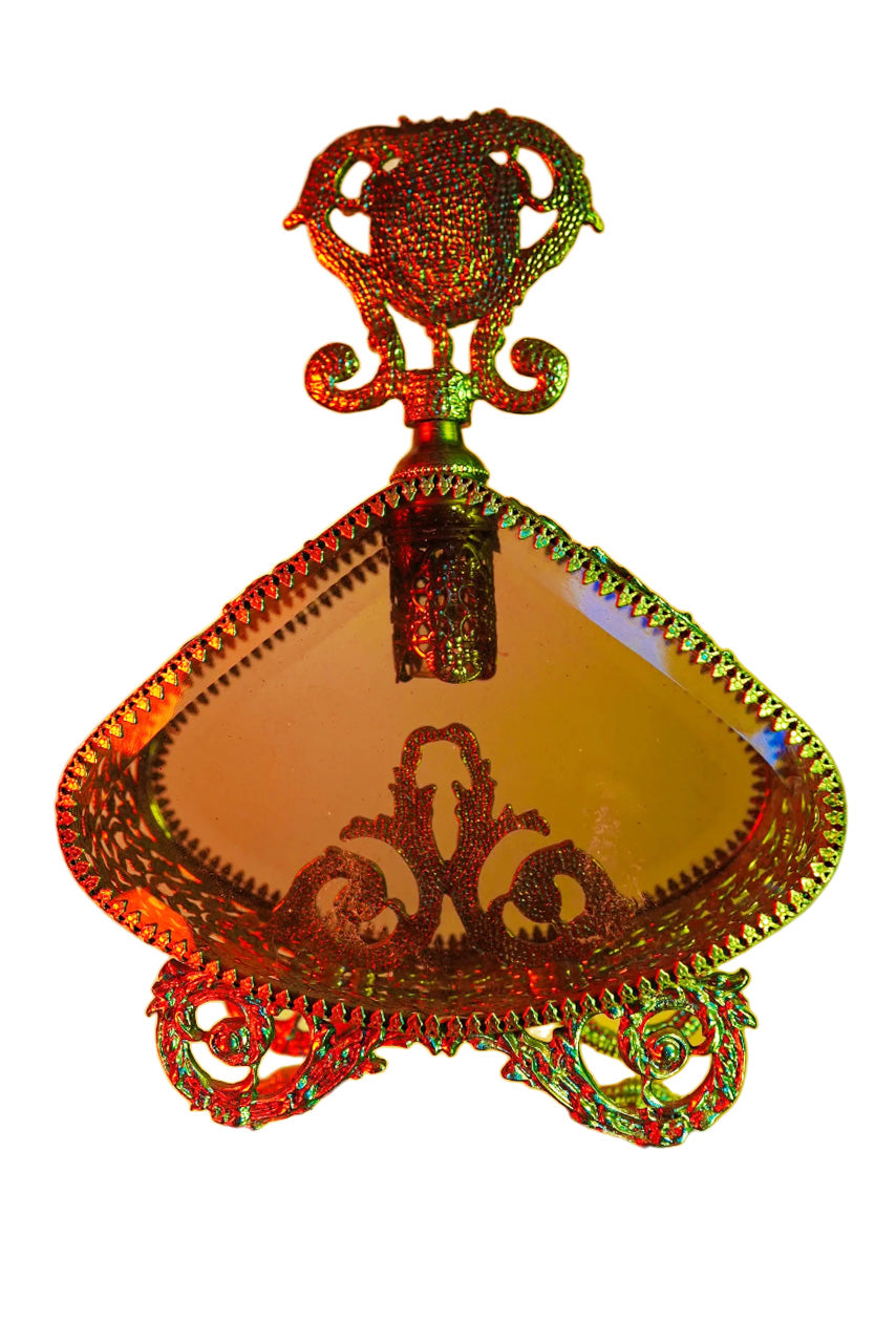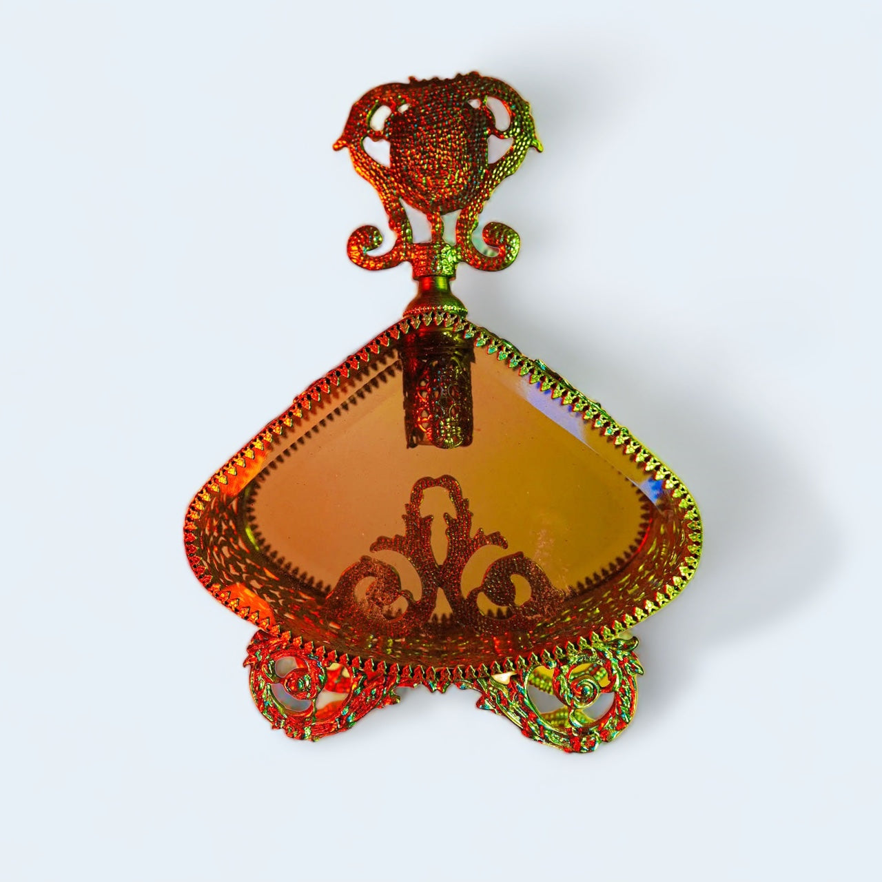 This Hollywood Regency brass vintage filigree perfume bottle is the perfect addition to any vanity decor. Its intricate filigree design sets the tone of luxury and elegance to your everyday home routine. Enjoy its one-of-a-kind look and indulge in the timeless shape and intricate details.