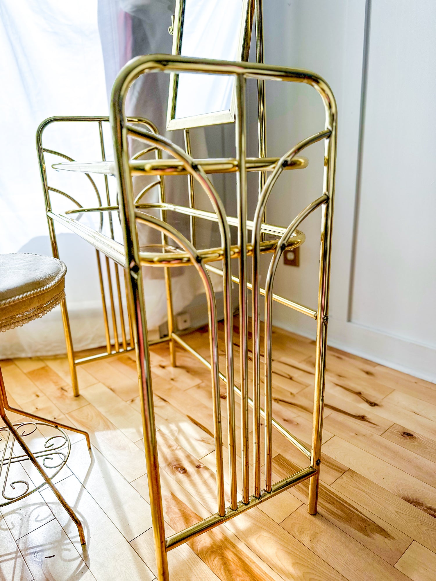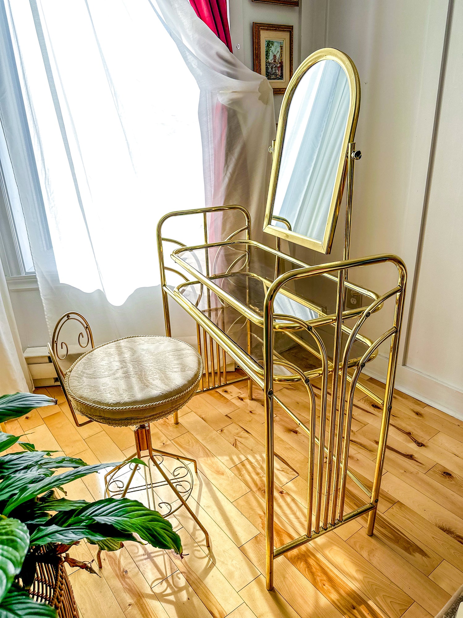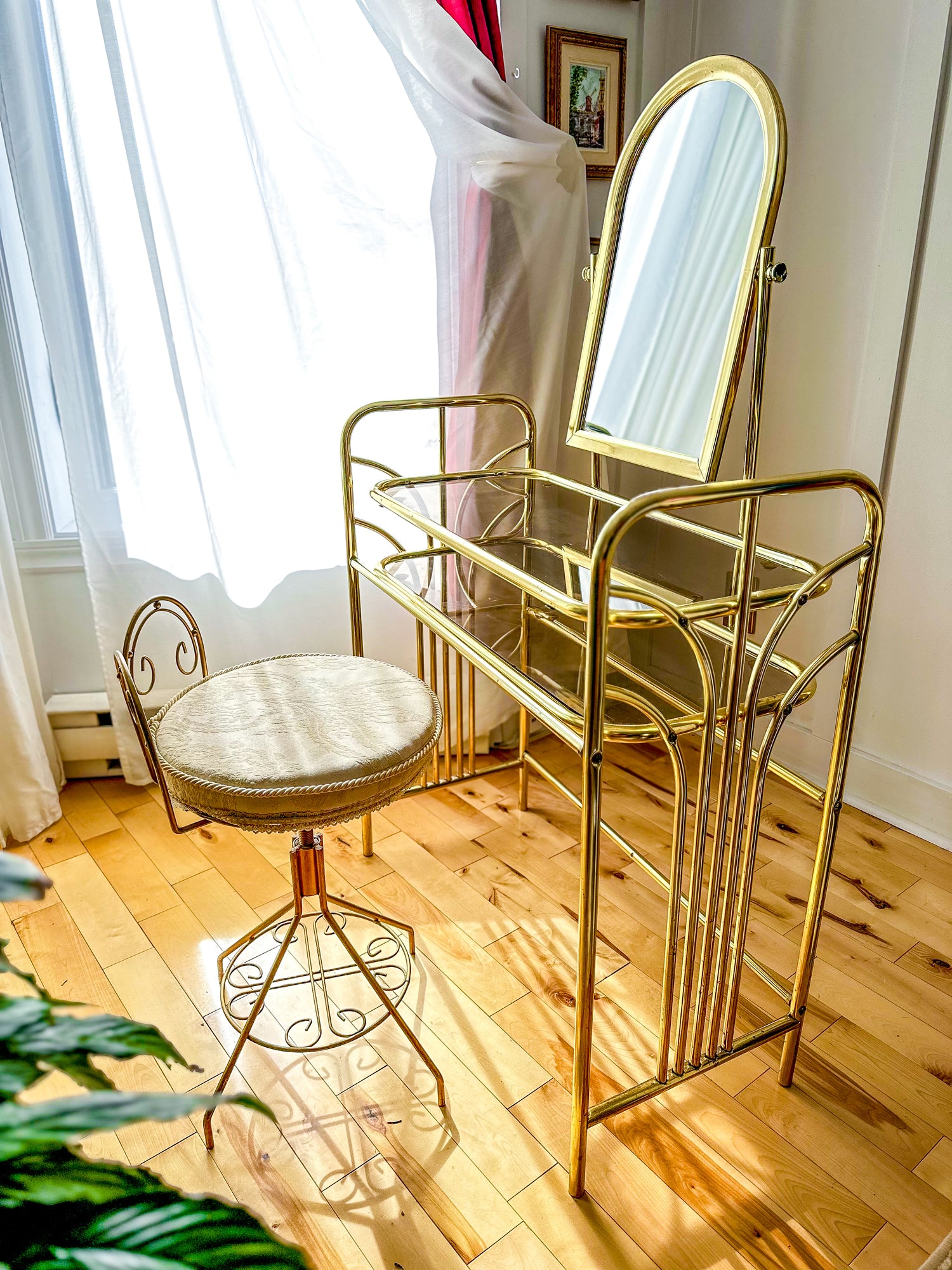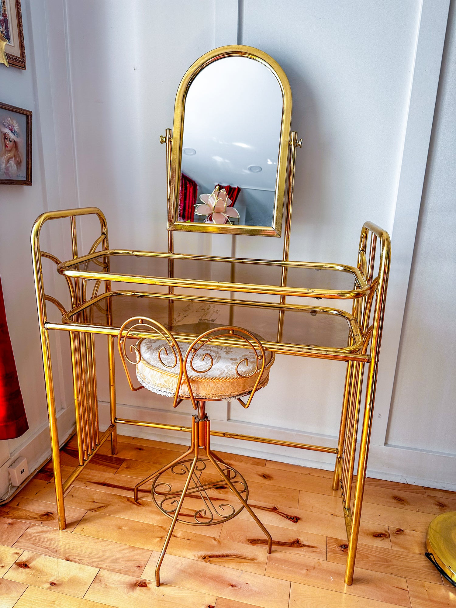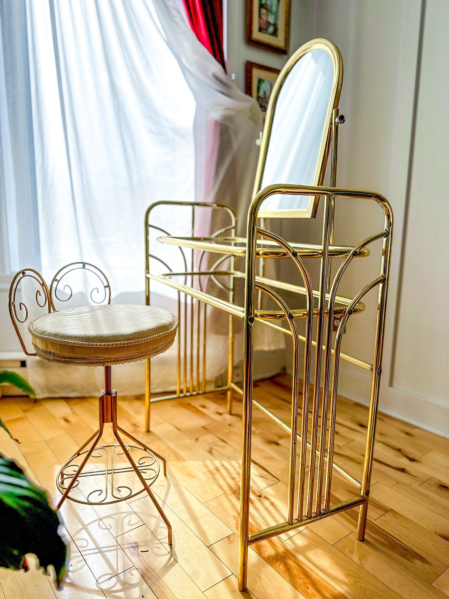 The Hollywood Regency Vintage Brass Vanity Set is the piece you have been looking for. Its gleaming brass finish and elegant vintage design add a warm, inviting glow, enhancing your dressing area with subtle luxury. This set combines style and practicality, making your daily beauty routine feel a little more special.