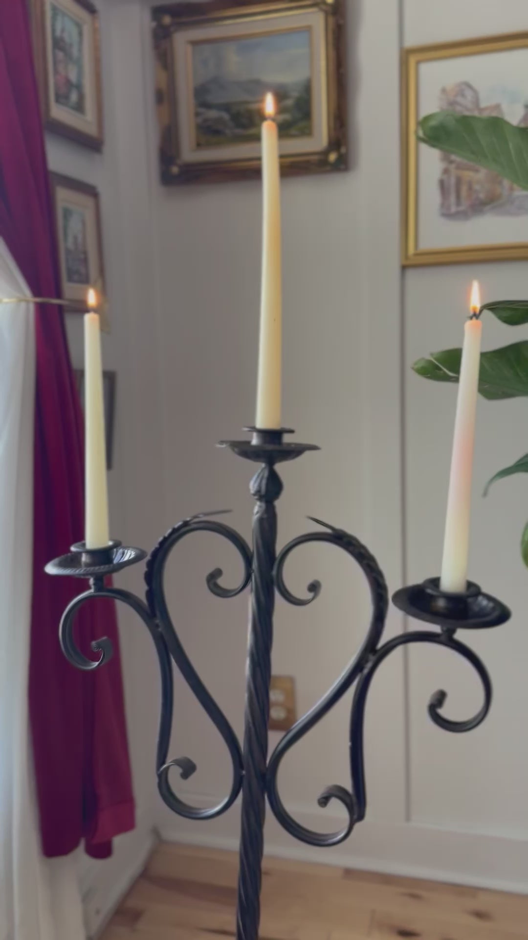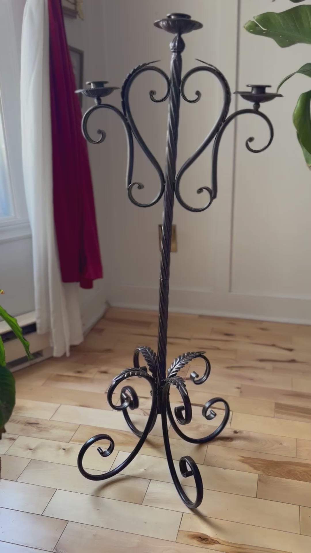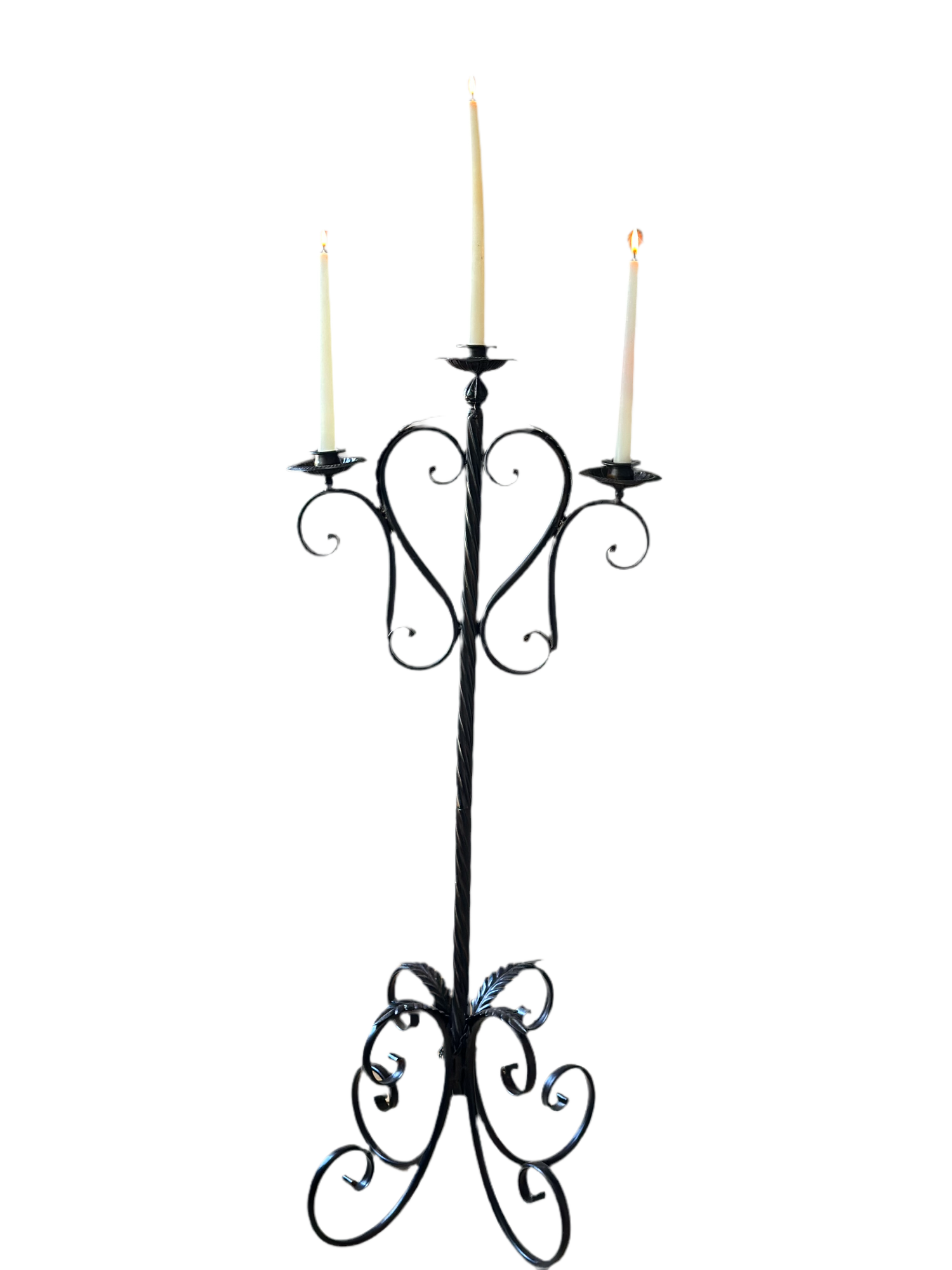 This Medieval Style Vintage Twisted Wrought Iron Candelabra features an intricate twisted design, crafted with high-quality wrought iron. Its antique look is perfect for medieval-themed events or for adding a touch of history to any space. Elevate any room with this vintage candelabra's timeless charm and elegance.
