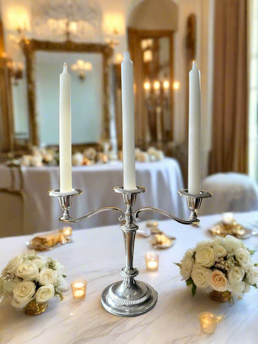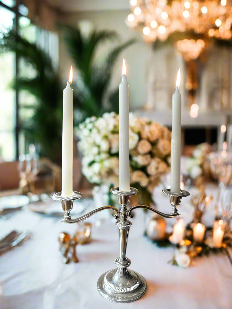 Expertly crafted in England, this Silver Table Vintage Candelabra is made from high-quality zinc for a classic and elegant look. Perfect for adding a touch of sophistication to any dining experience. Made to last and impress.