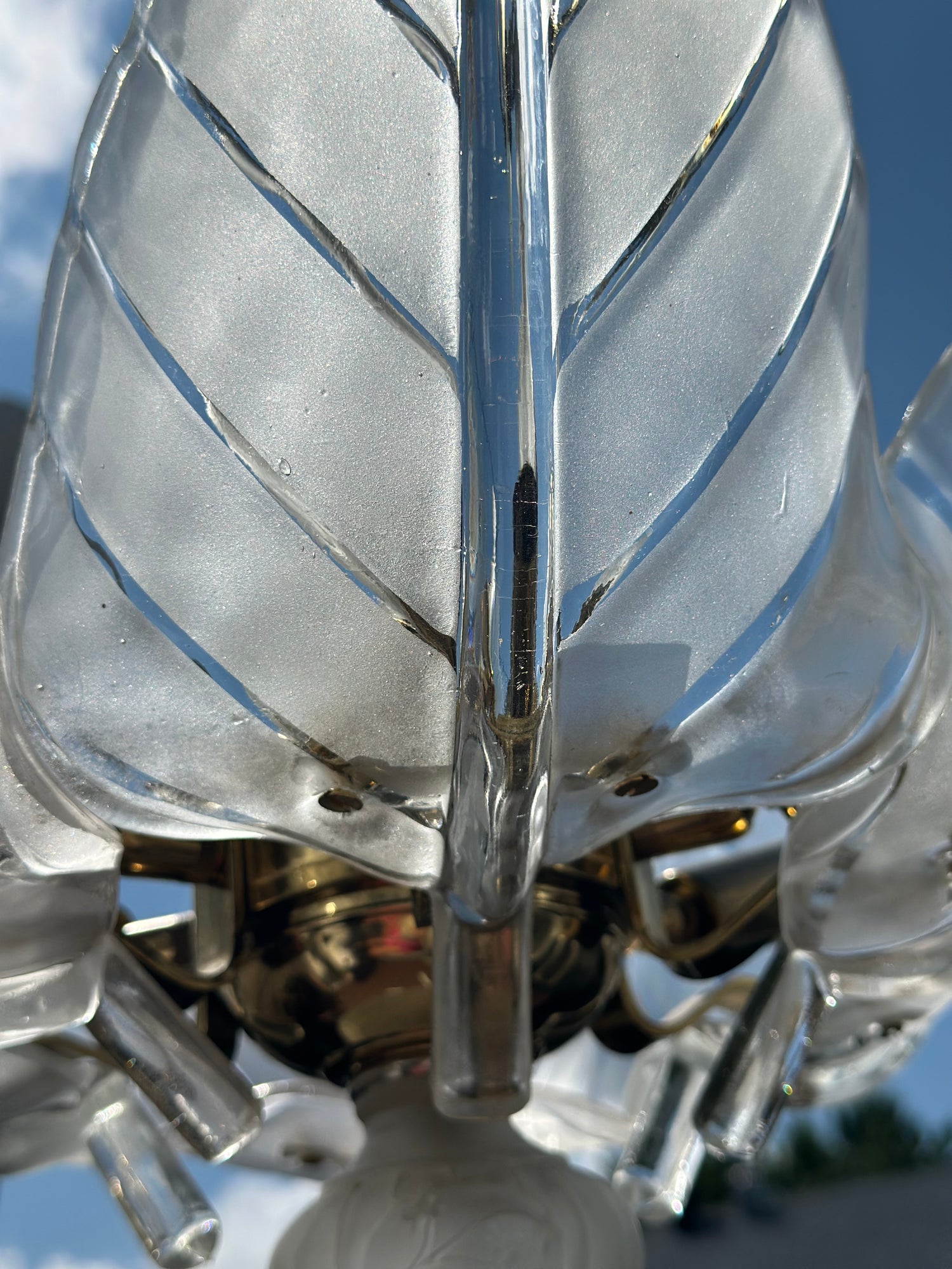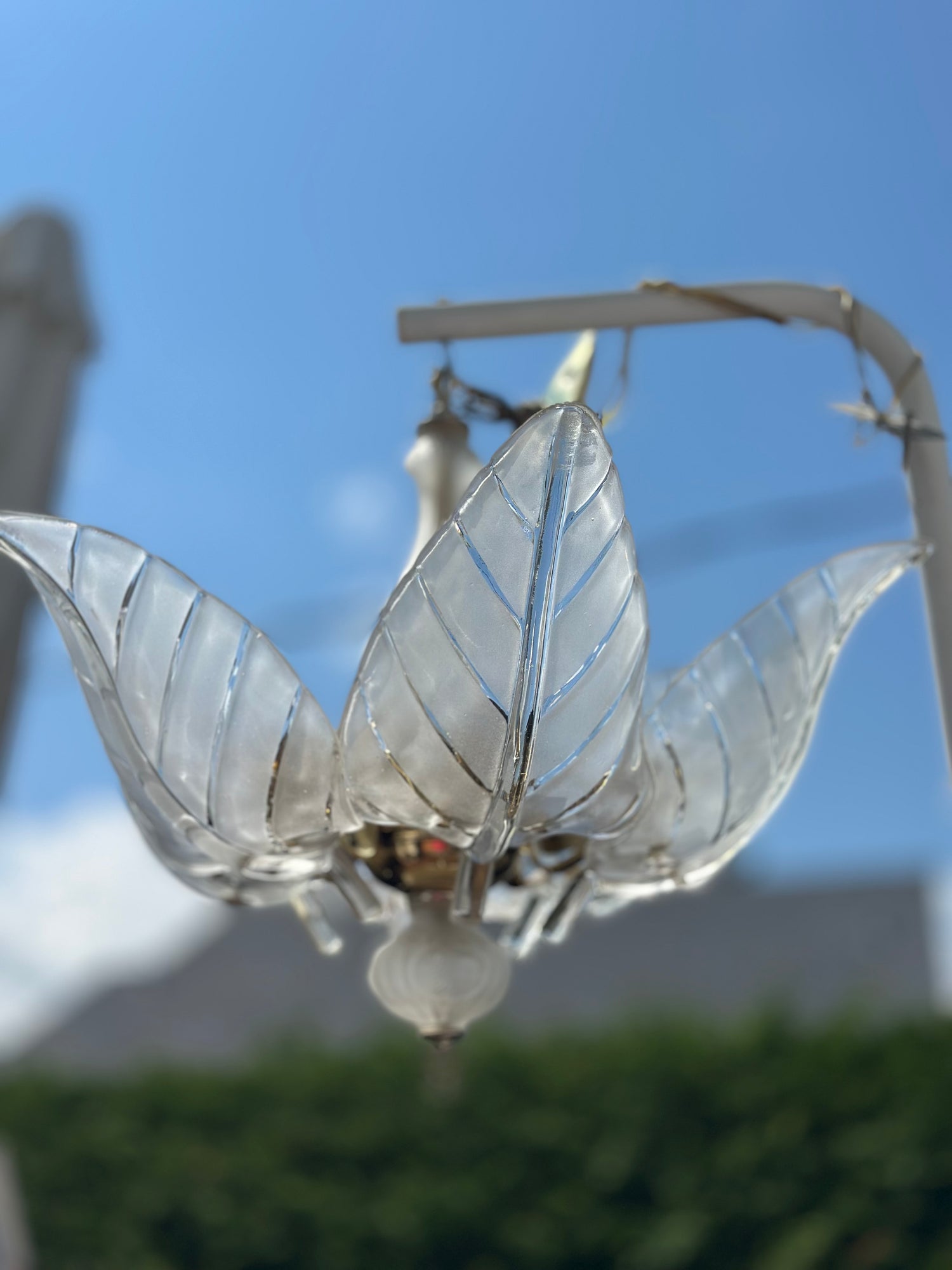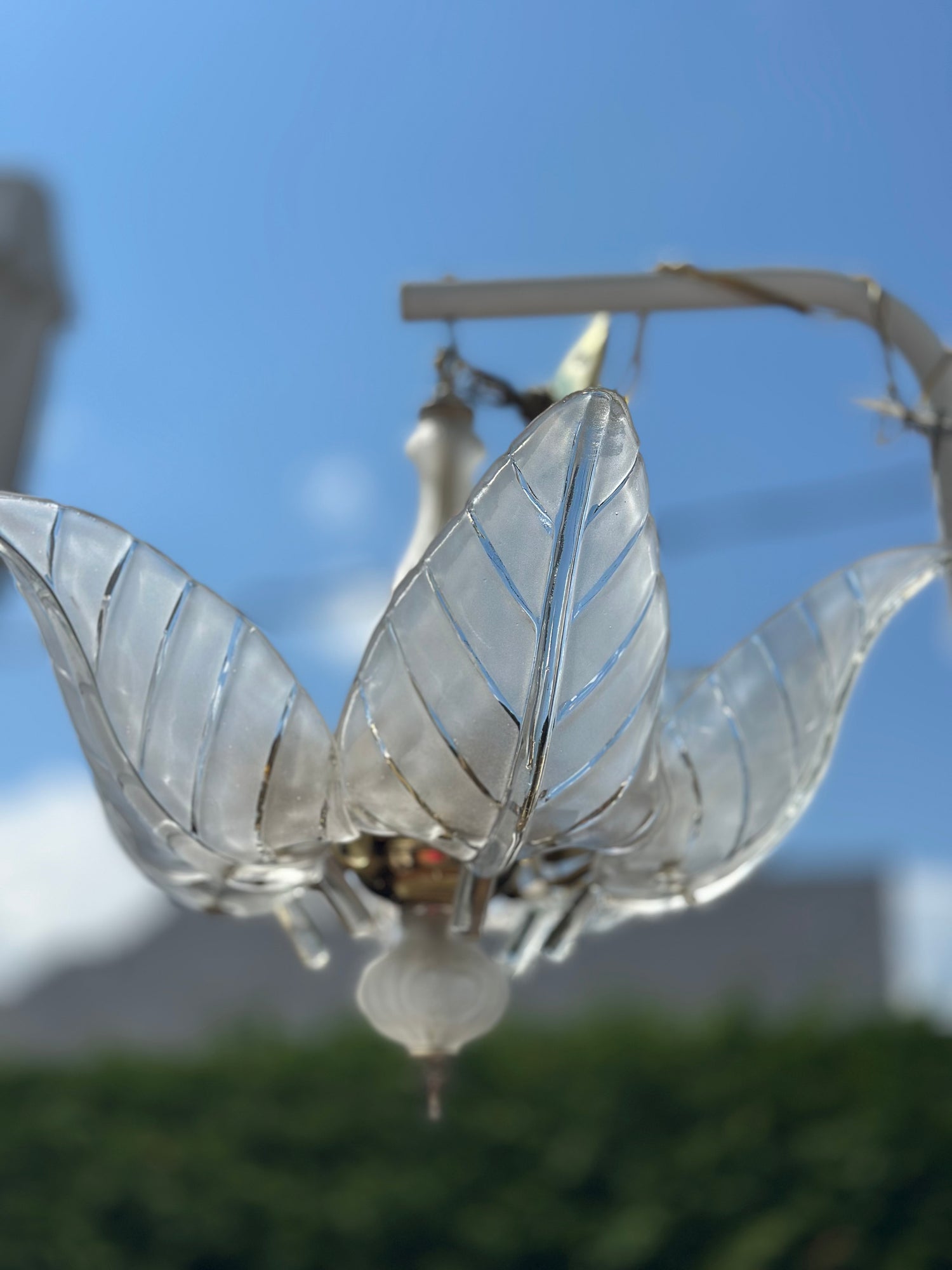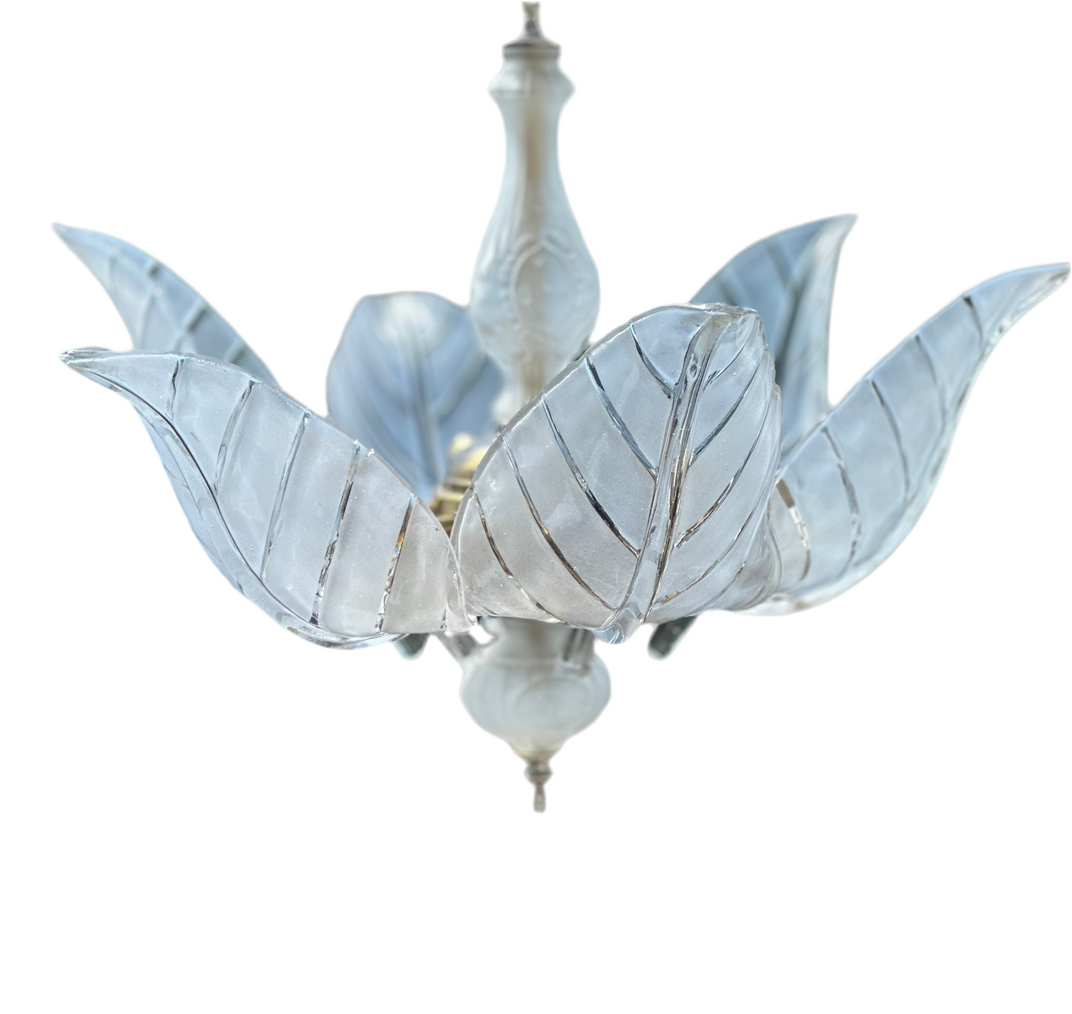 Leaf-shaped chandeliers, like this one, often evoke nature’s elegance and fragility. The number six, present here in the form of six glass leaves, traditionally symbolizes harmony, balance, and beauty—qualities echoed in the chandelier’s symmetrical design. Its central column and base are also made entirely of frosted glass, reinforcing a sense of continuity throughout the piece.