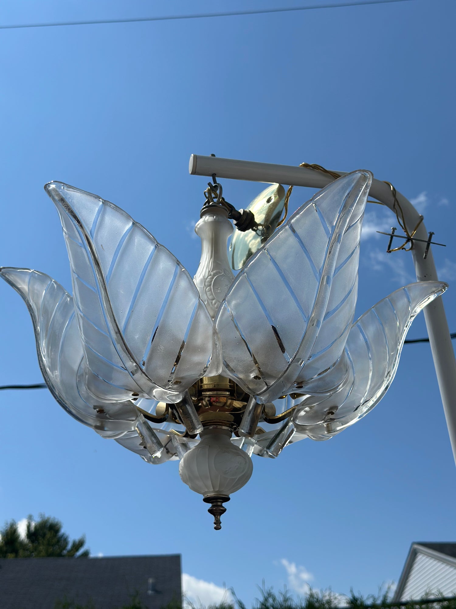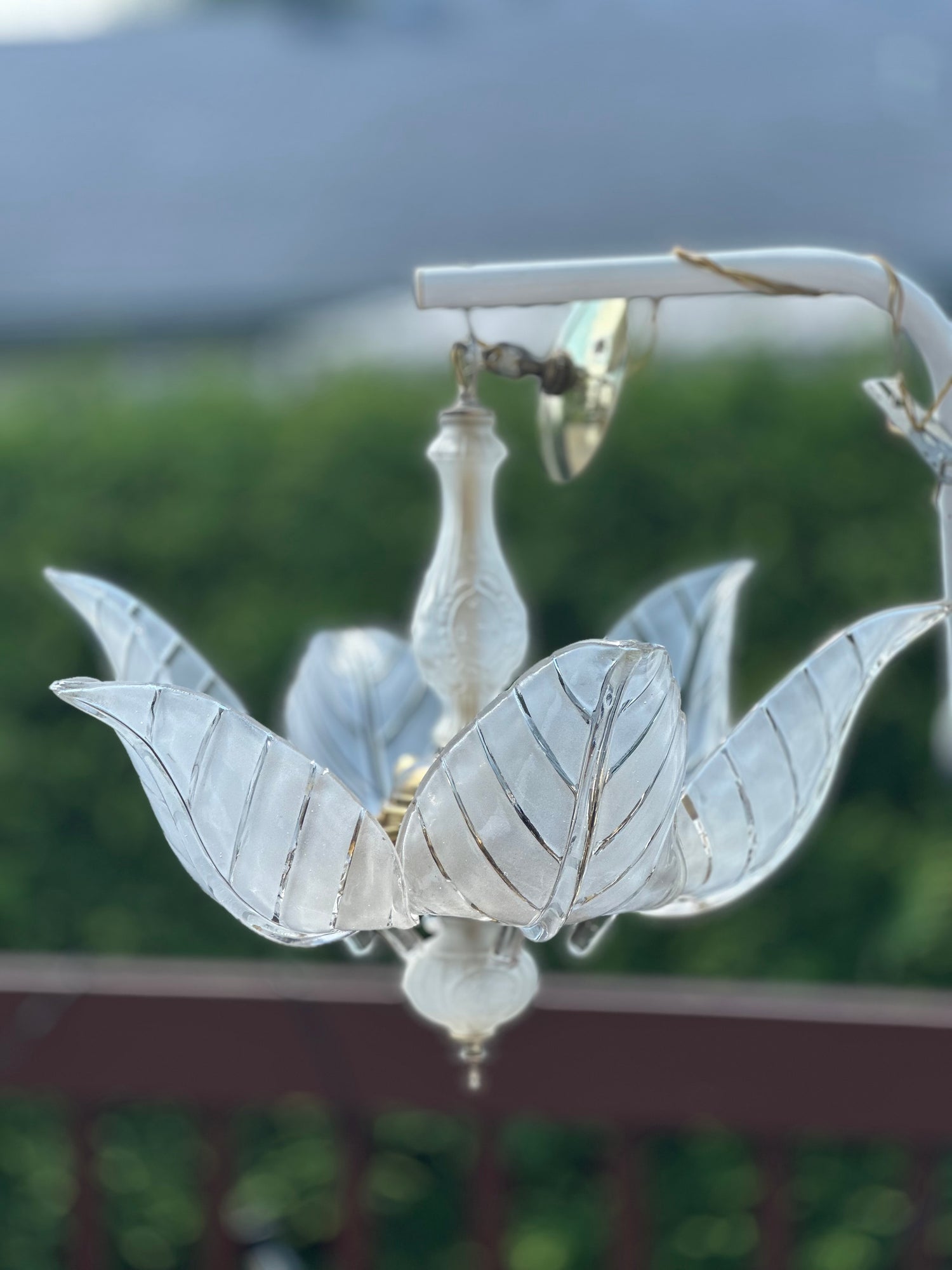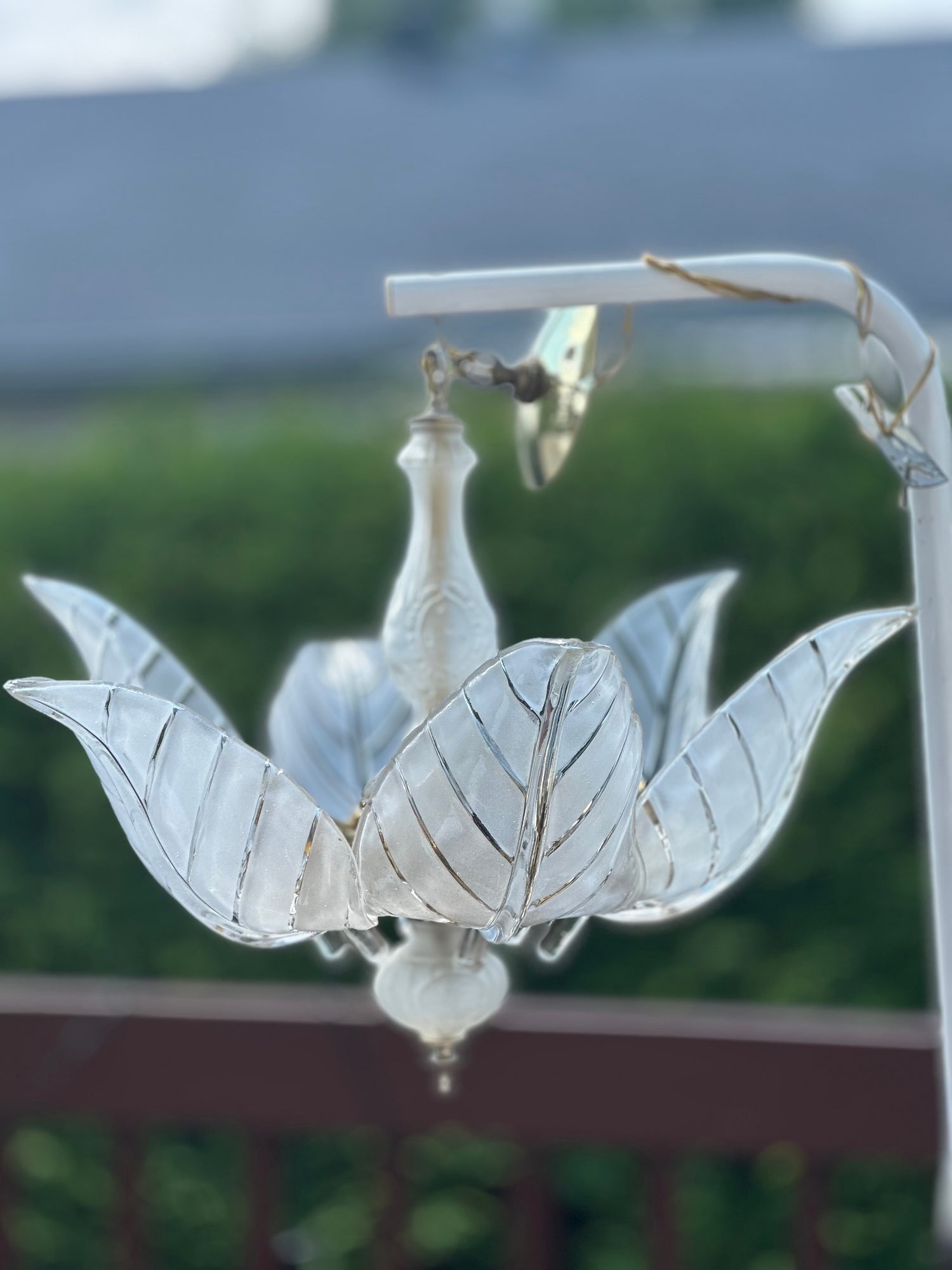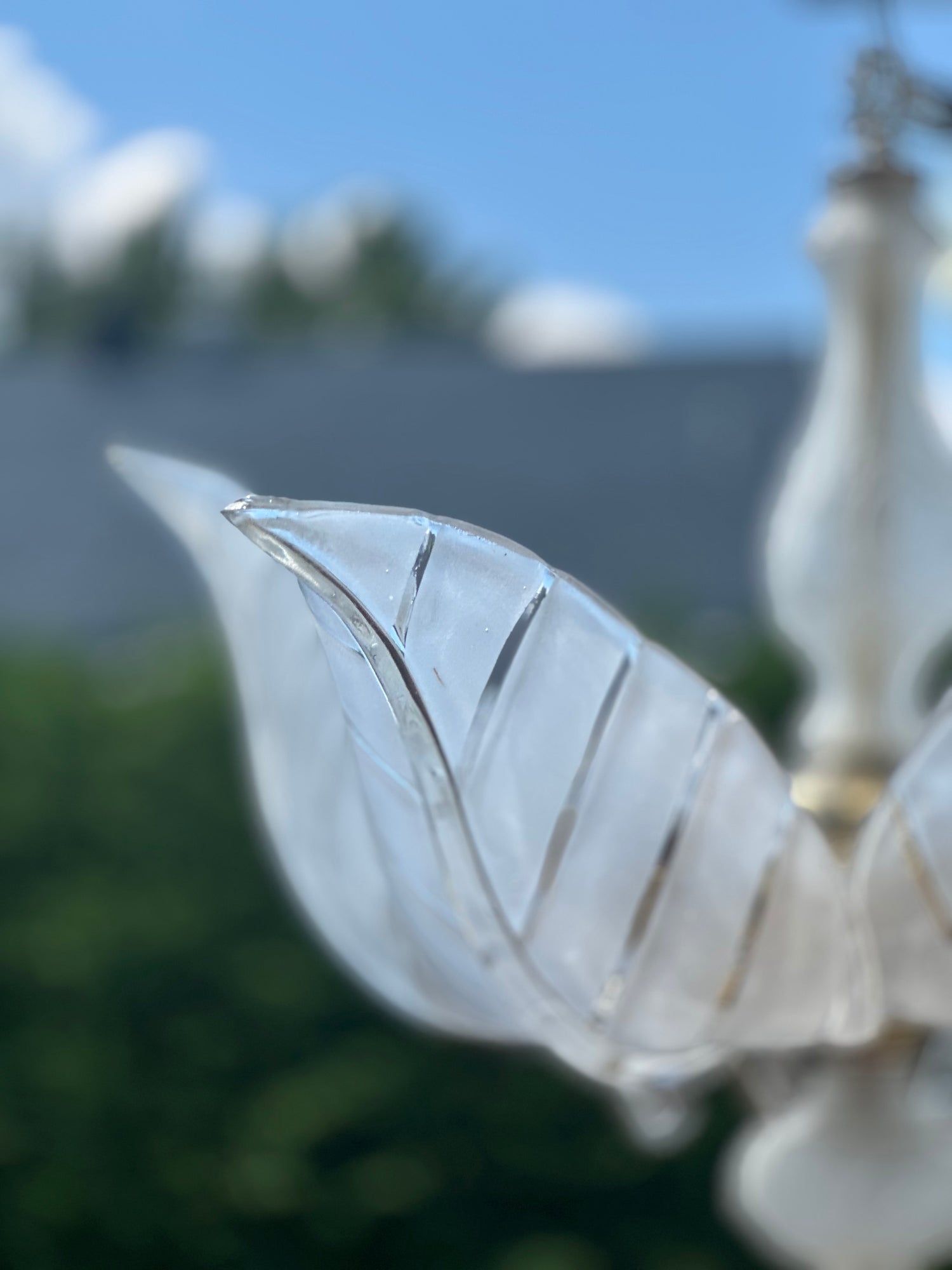 Leaf-shaped chandeliers, like this one, often evoke nature’s elegance and fragility. The number six, present here in the form of six glass leaves, traditionally symbolizes harmony, balance, and beauty—qualities echoed in the chandelier’s symmetrical design. Its central column and base are also made entirely of frosted glass, reinforcing a sense of continuity throughout the piece.