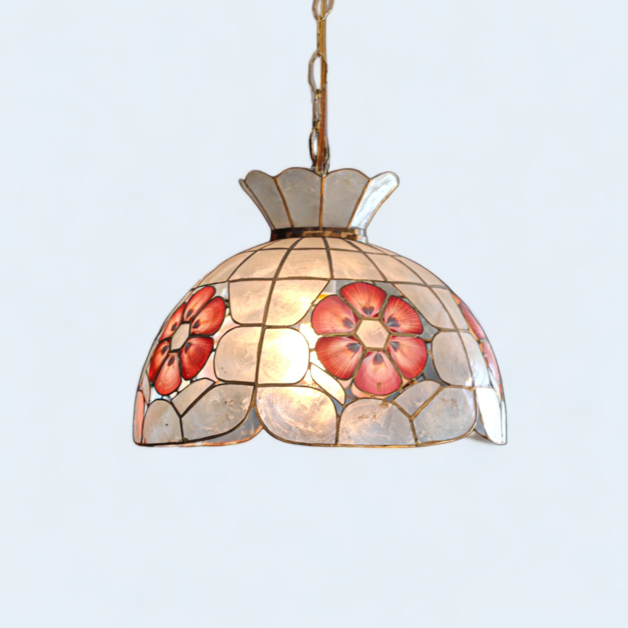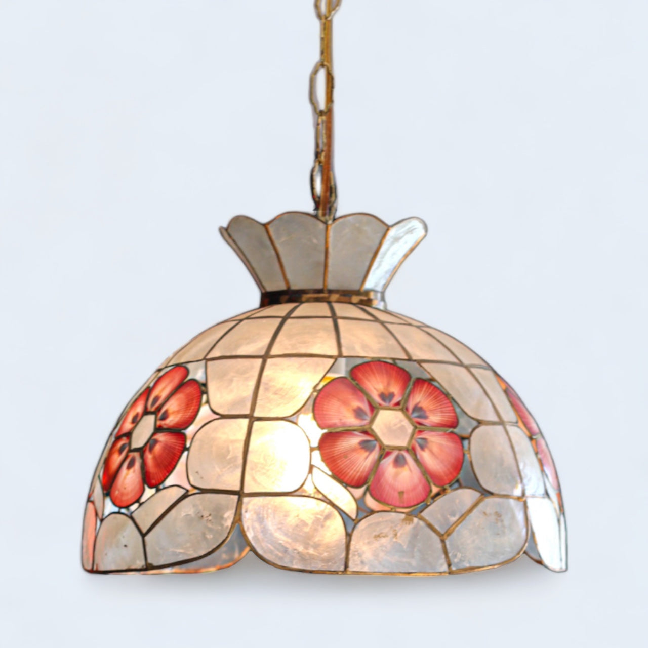 This stylish mid-century pendant features a stunning gold chain and a choice of striking finishes made of mother of pearl, seashell, or capiz. The combination of modern and natural materials creates a warm and eye-catching look.