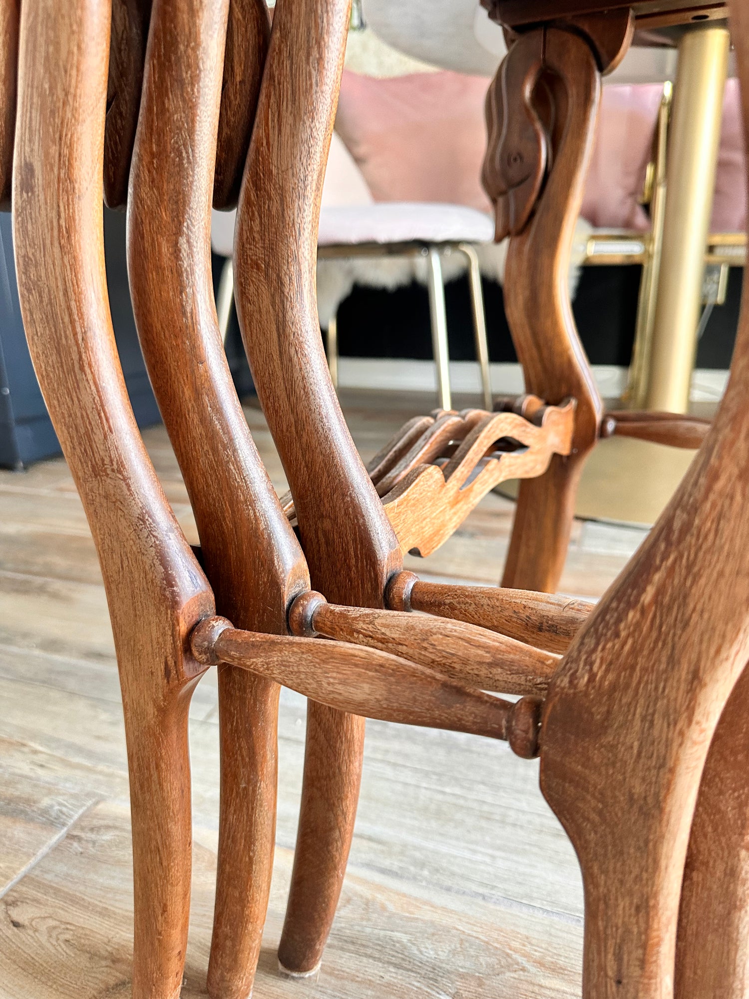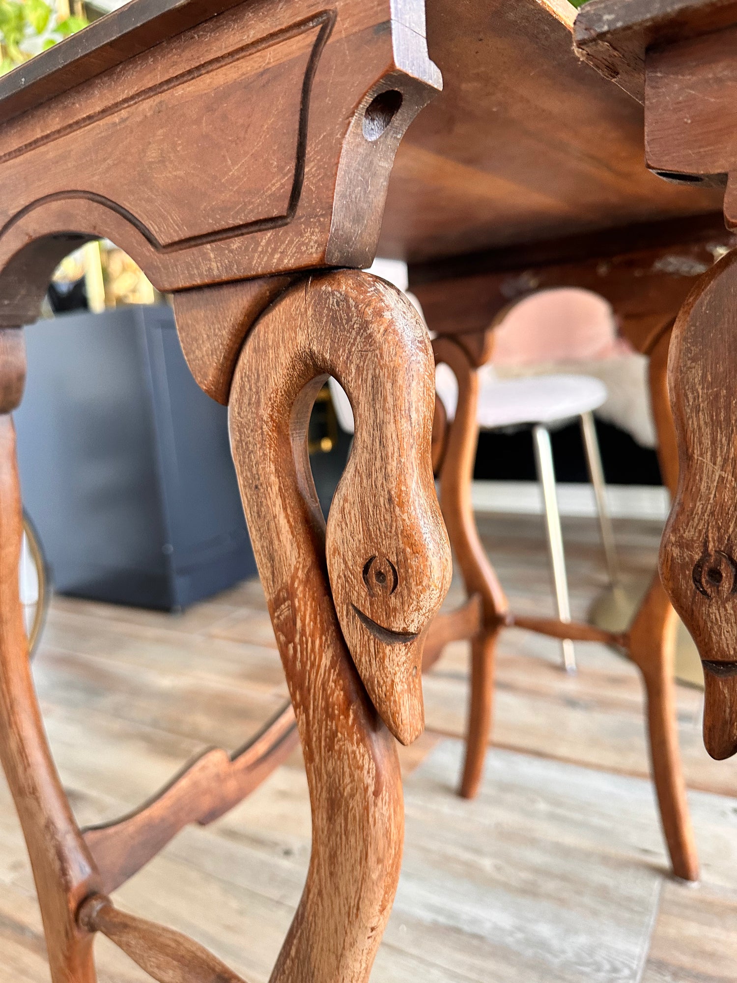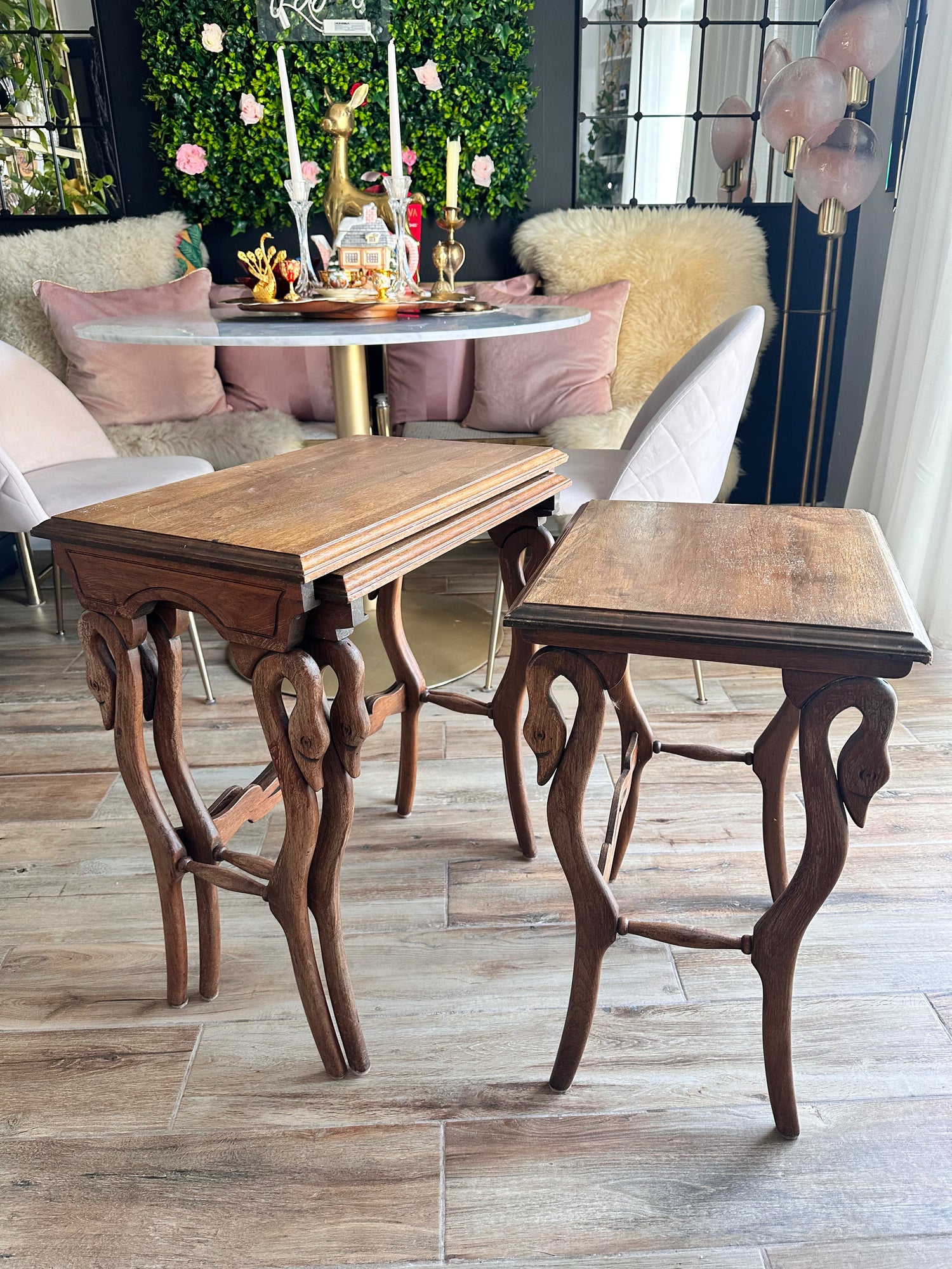 Expertly crafted in 1850, these Antique Swan Nesting Tables are a stunning addition to any home. The beautifully carved wood and intricate swan face design are very hard to find in today’s market. The set of 3 nesting tables provide both functional and aesthetic benefits, offering versatility and adding a vintage charm. Scratches on the the wood are visible due to its old age and some visible wear on the corners on the tables. Possibility of restoration by gently sanding it by hand and covering it up in a wood stain of the color of your choice, if you chose to do so.