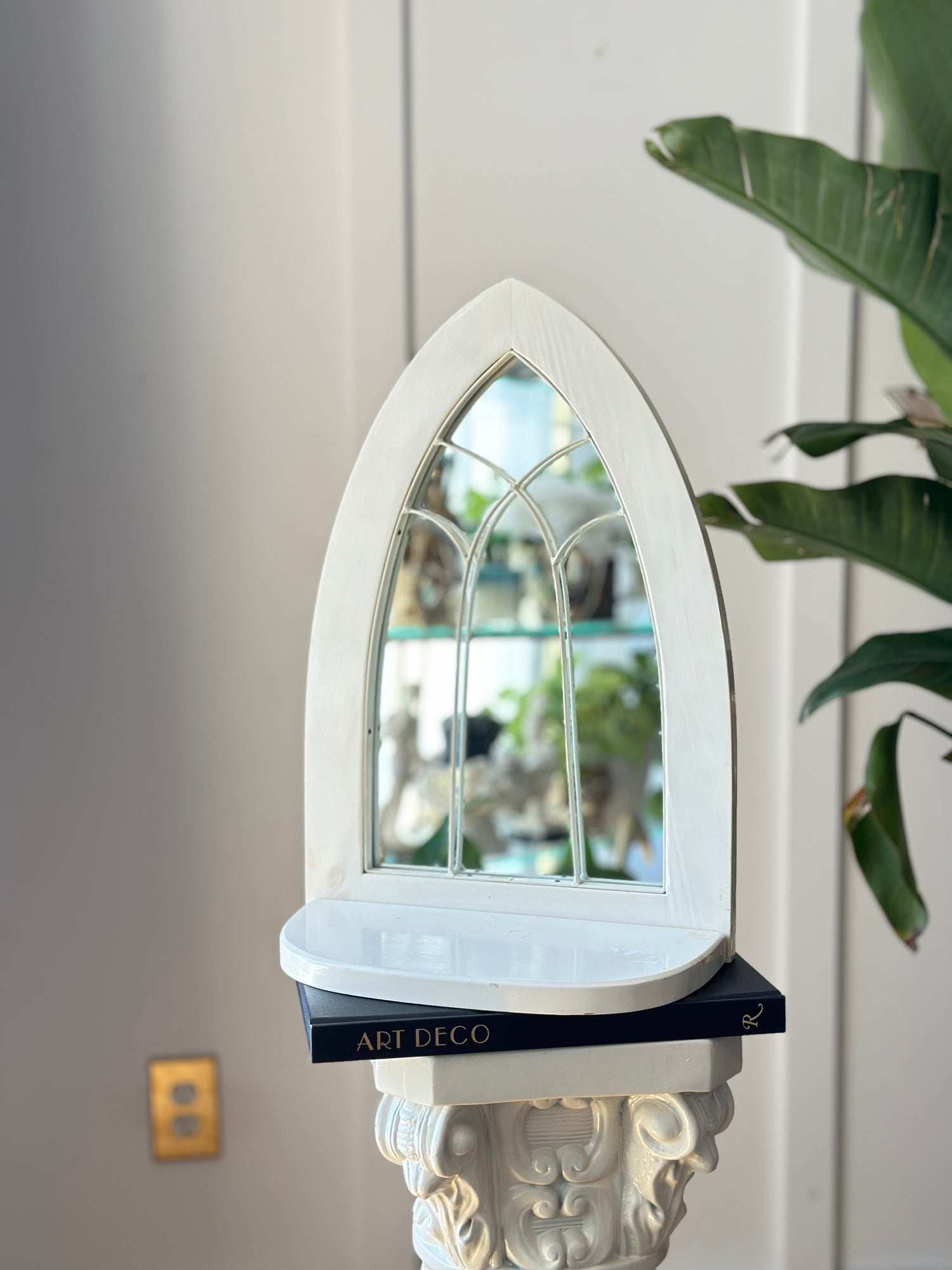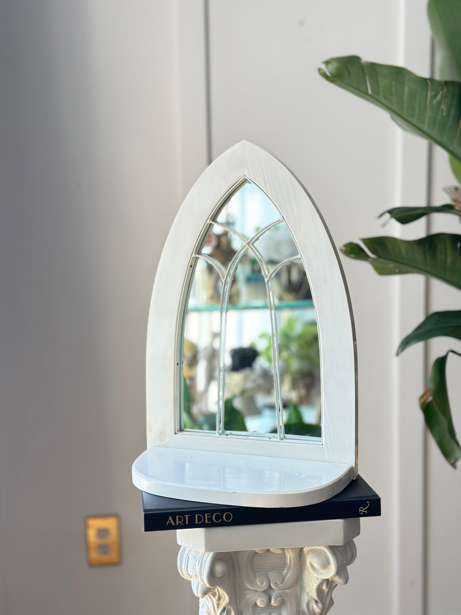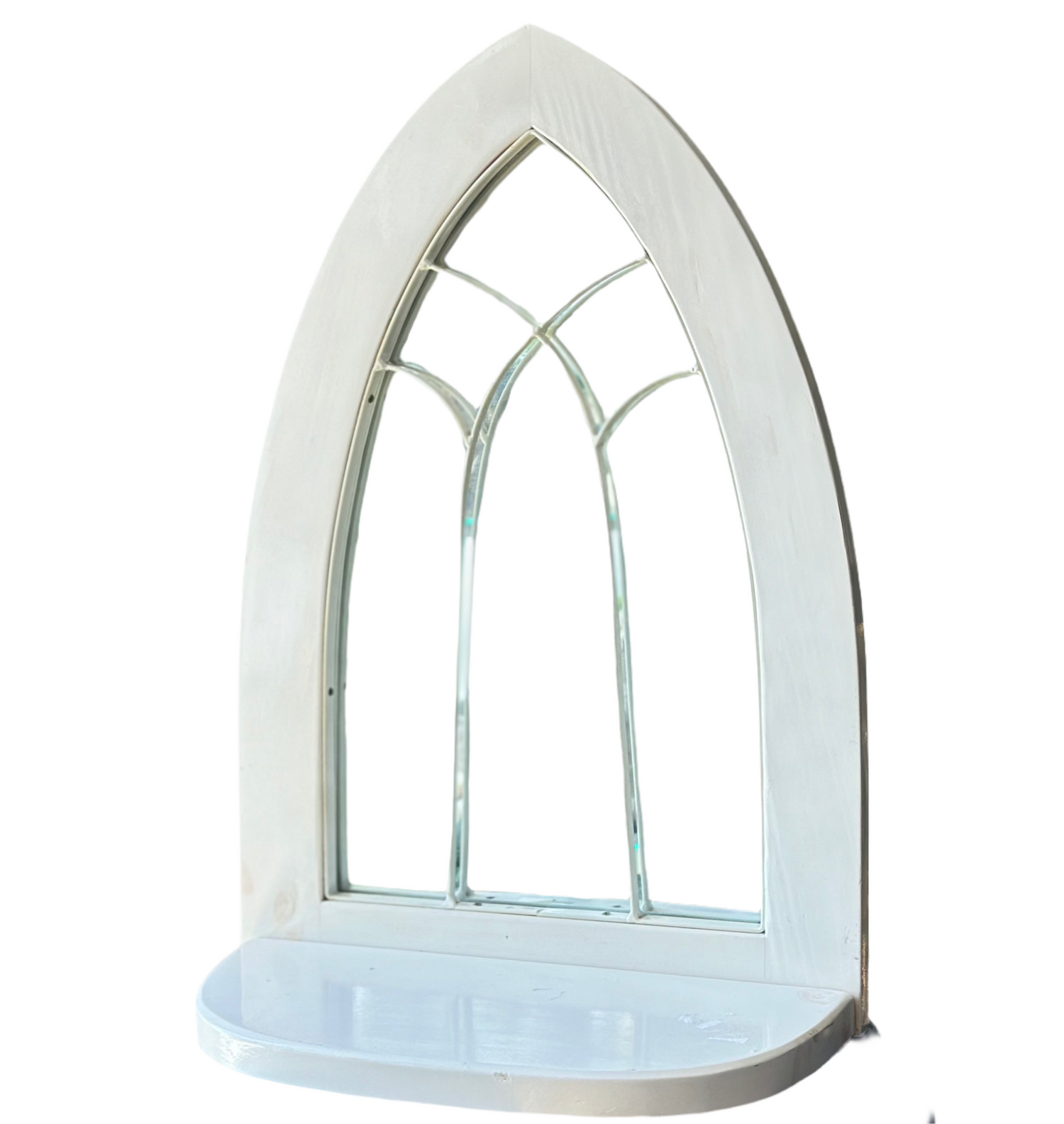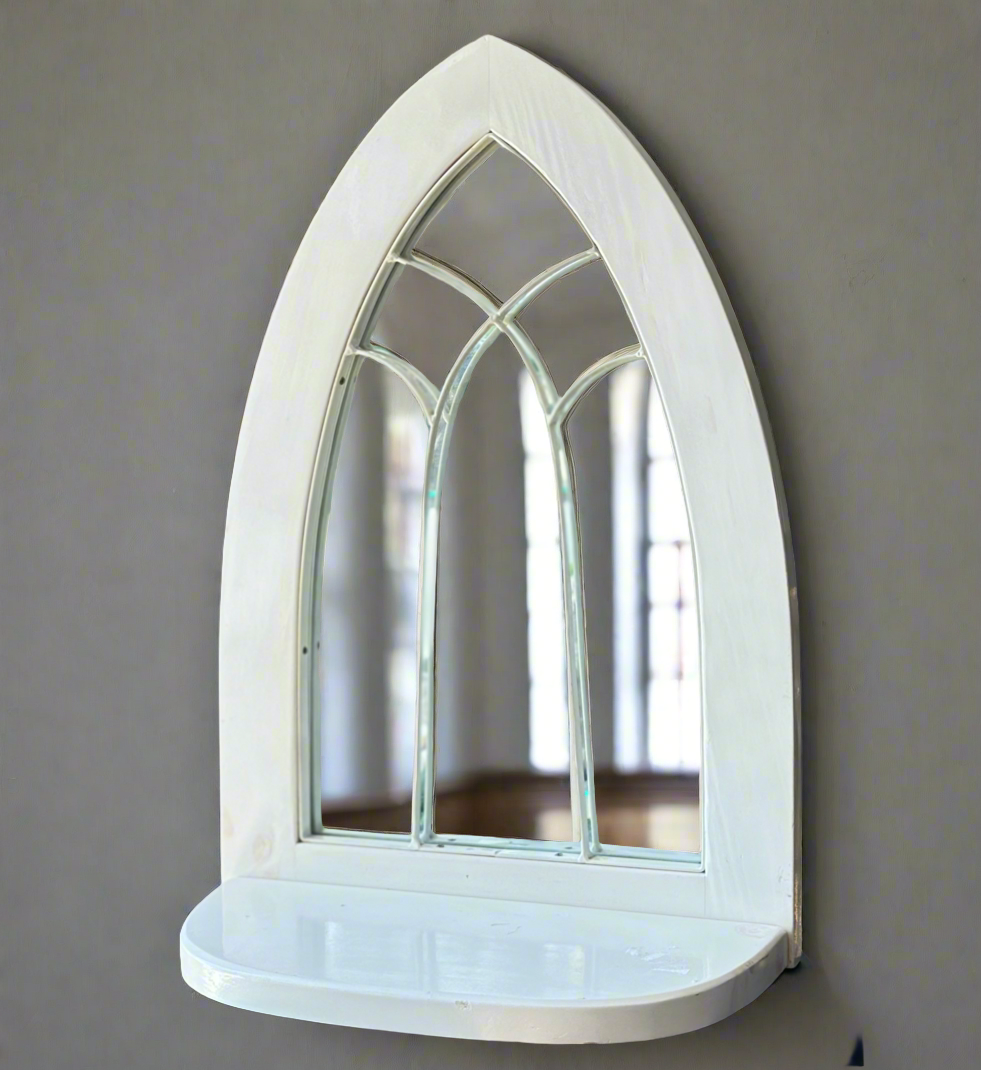 Arched European Cathedral Window Mirror with Shelf in White