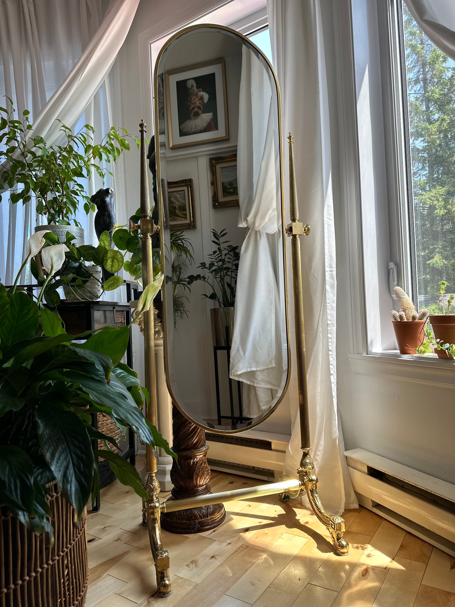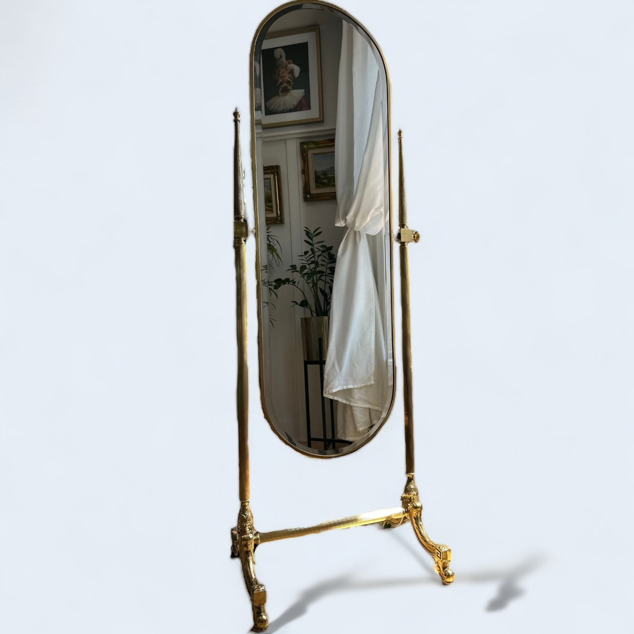 This Italian Vintage Brass Standing Mirror adds a touch of timeless elegance to any room. Crafted from high-quality vintage brass, its sturdy construction ensures lasting durability and a beautiful reflection for years to come. Complemented by its clean lines and intricate design, this unique standing mirror will be a timeless addition to any space.
