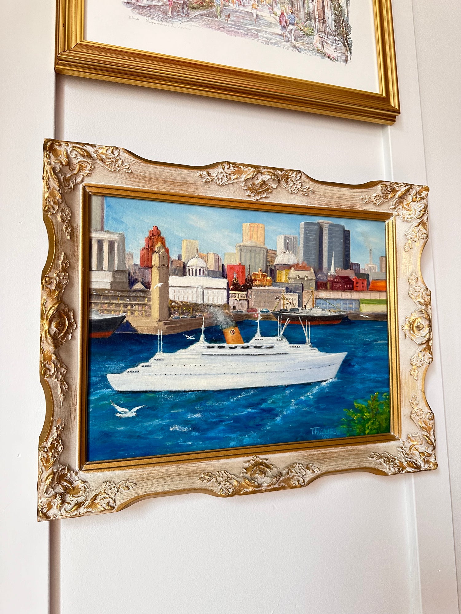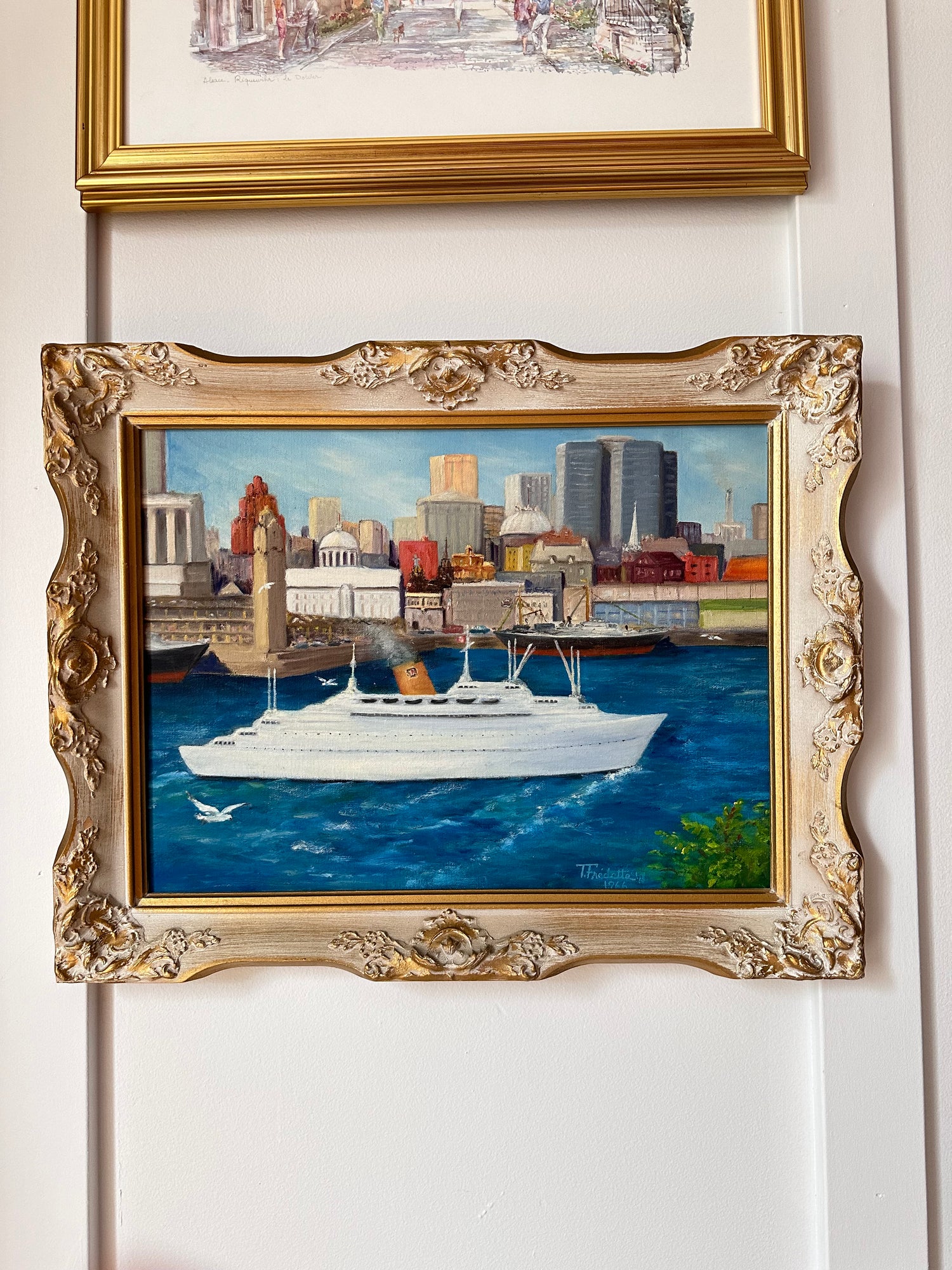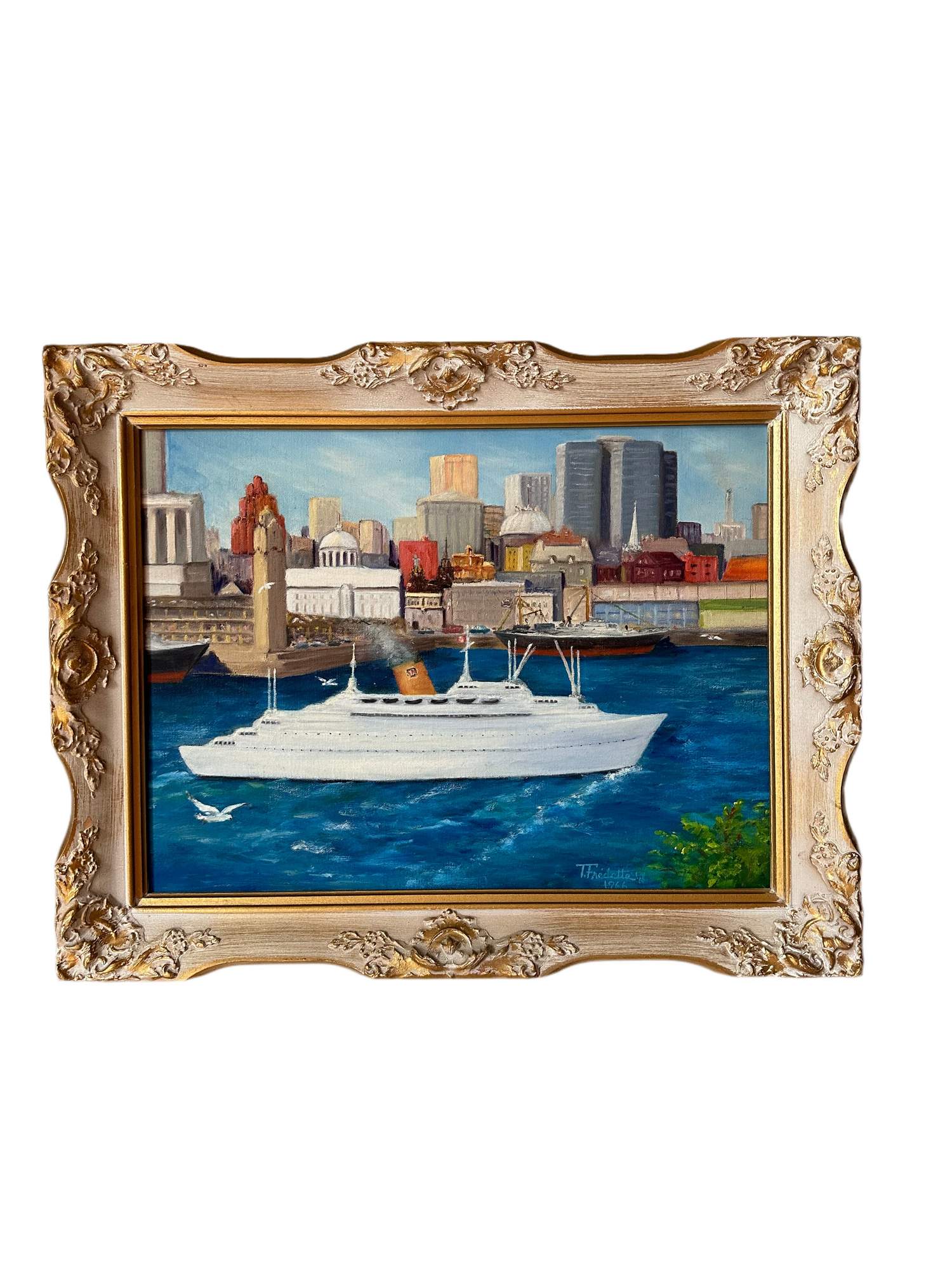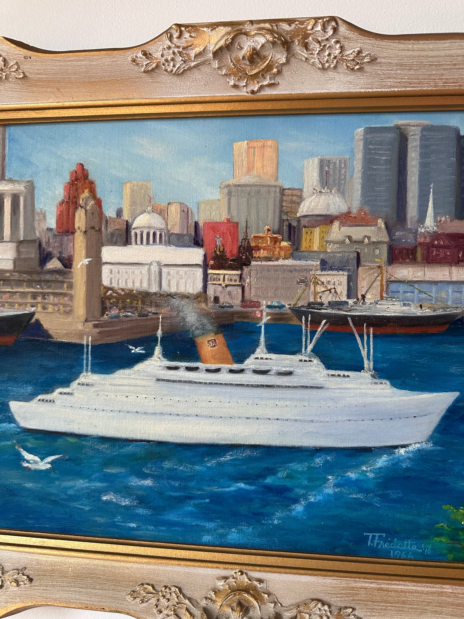 This stunning painting features a waterside view of Old Montreal, captured in 1966 from Saint Helen Island (Île Sainte Hélène).