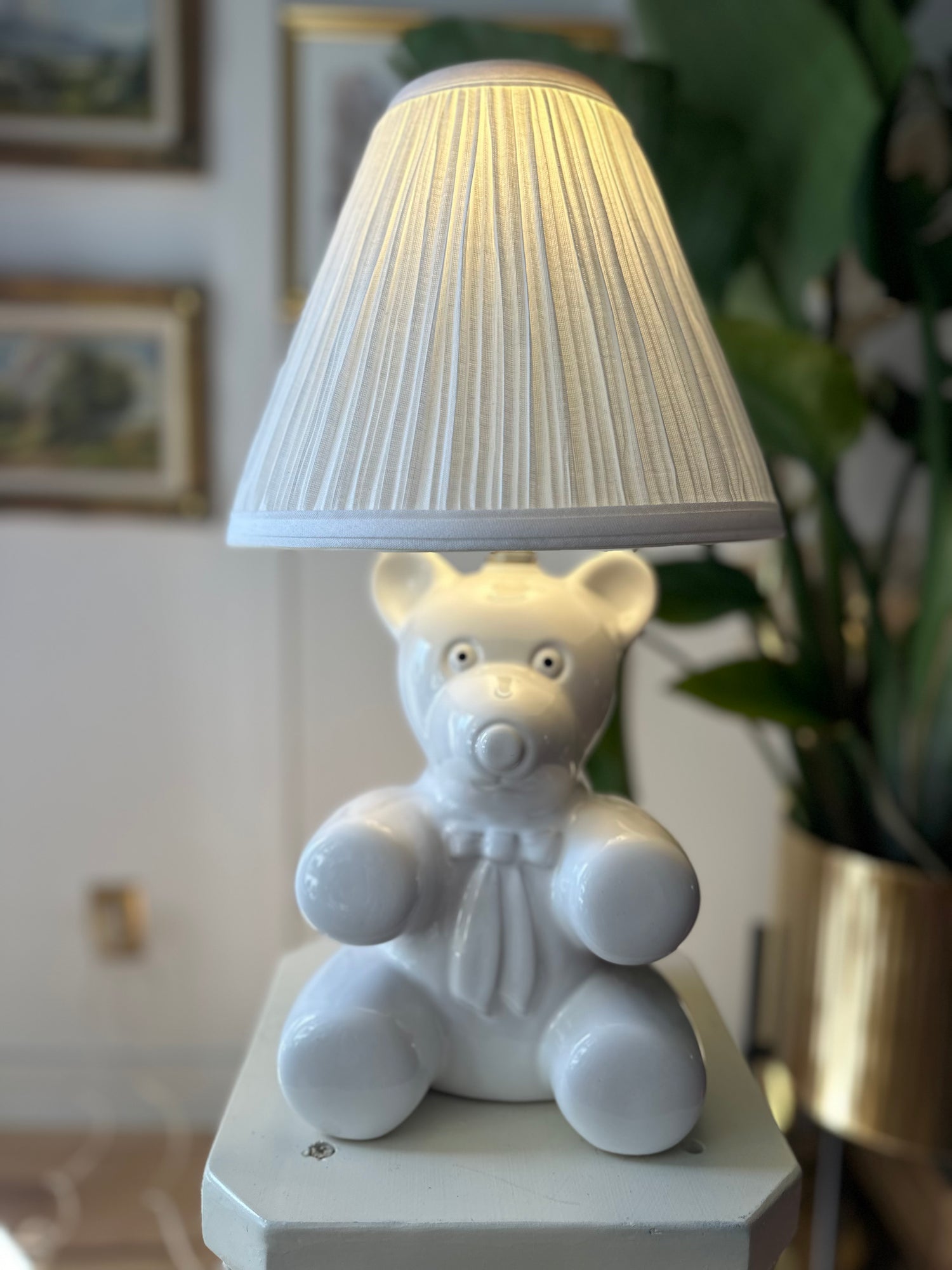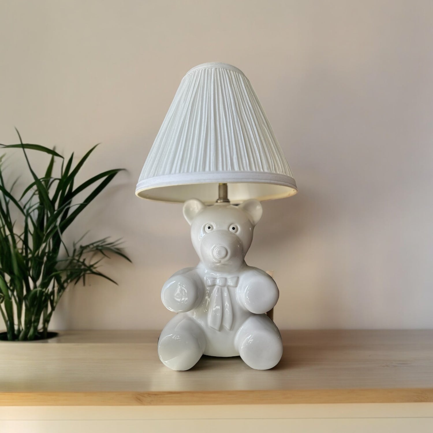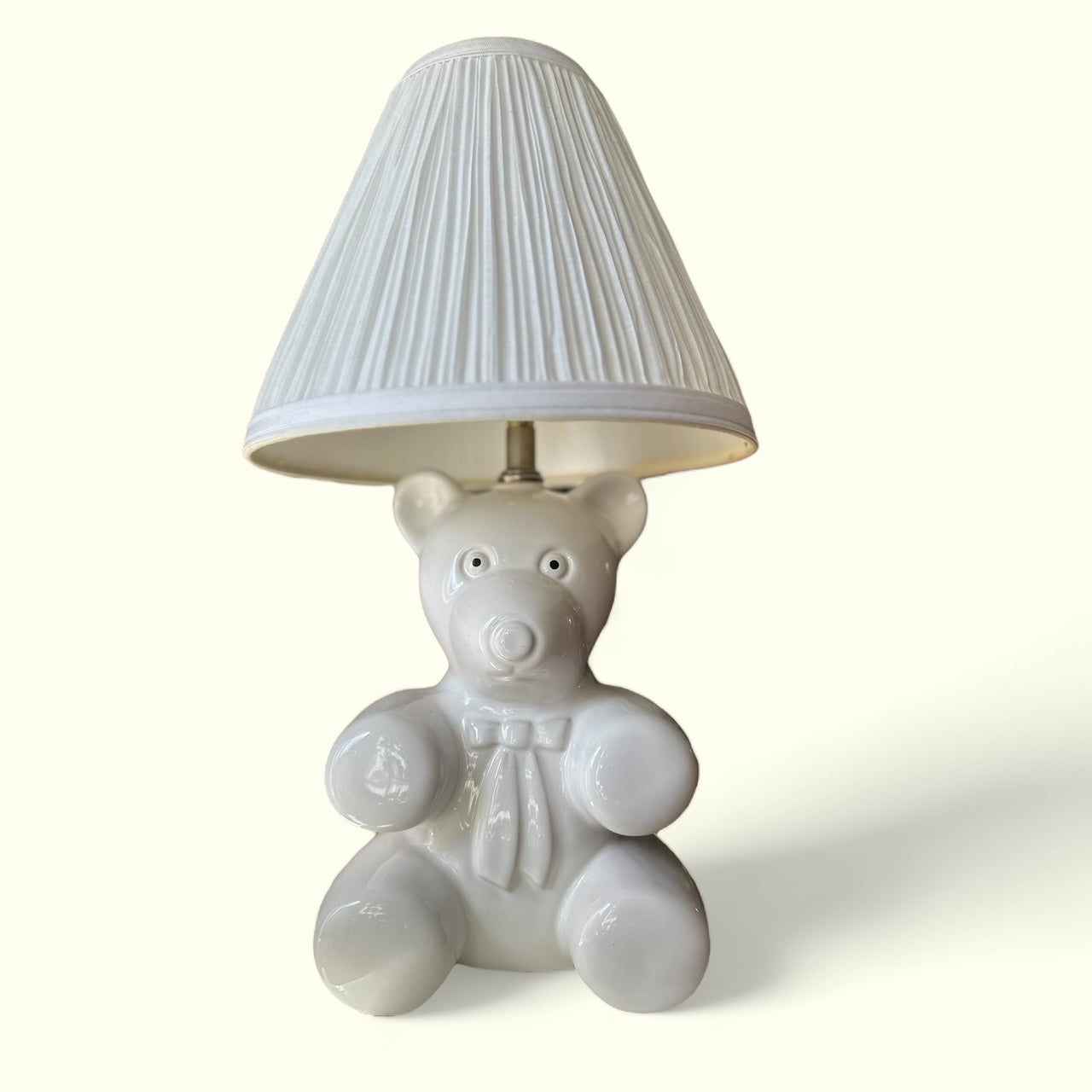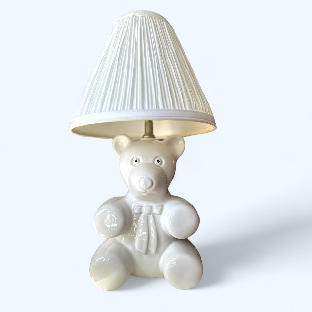 This adorable Teddy Bear Vintage Lamp is the perfect addition to any baby or children's room. With its unique teddy bear shaped design and original fabric shade, it adds a soft and soothing ambience light. A charming and functional piece for a cozy and inviting atmosphere.
