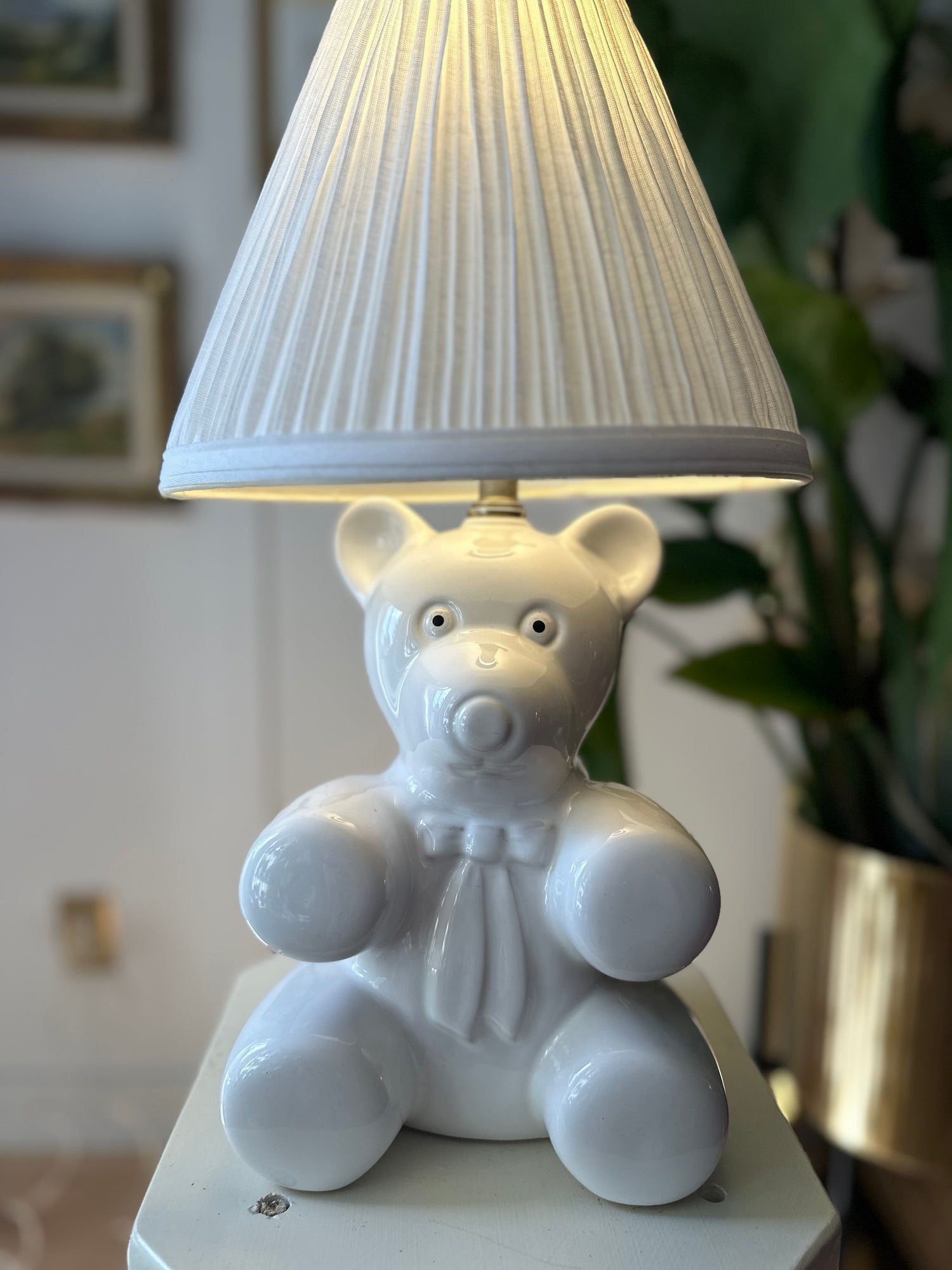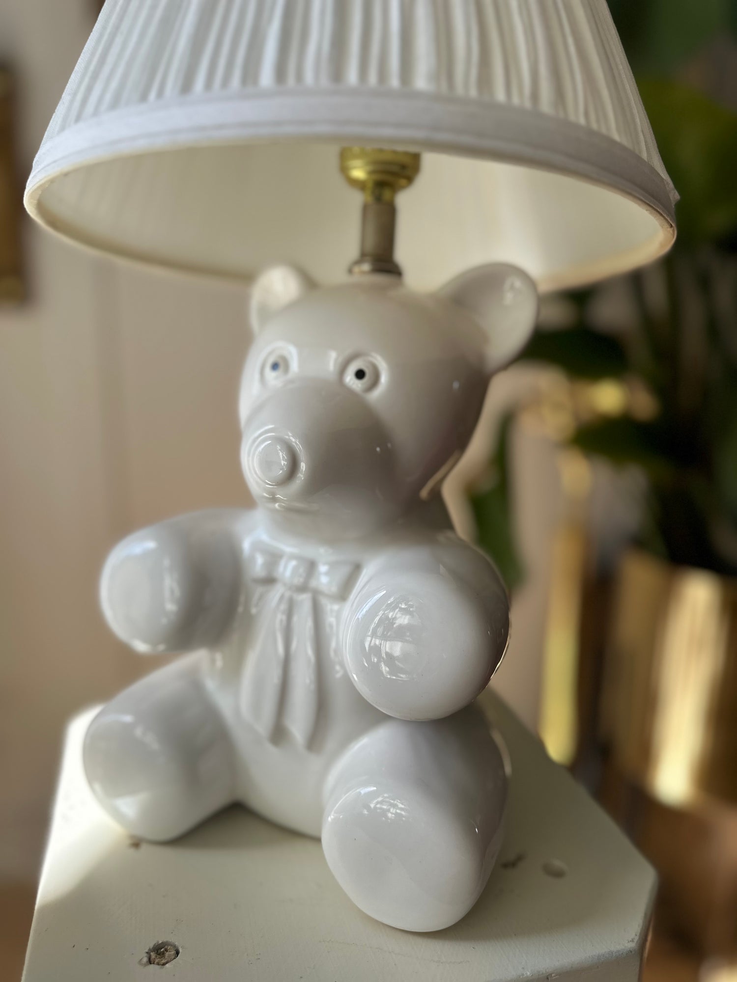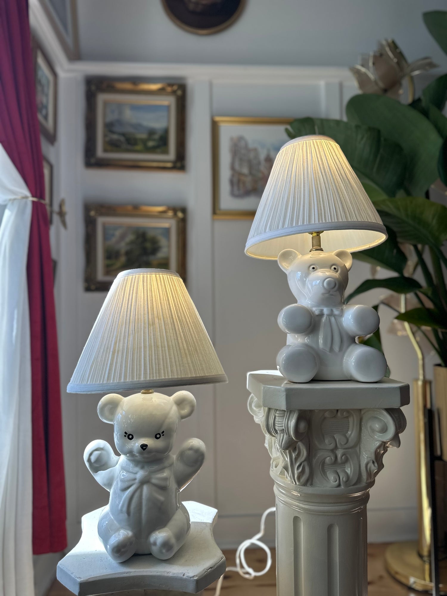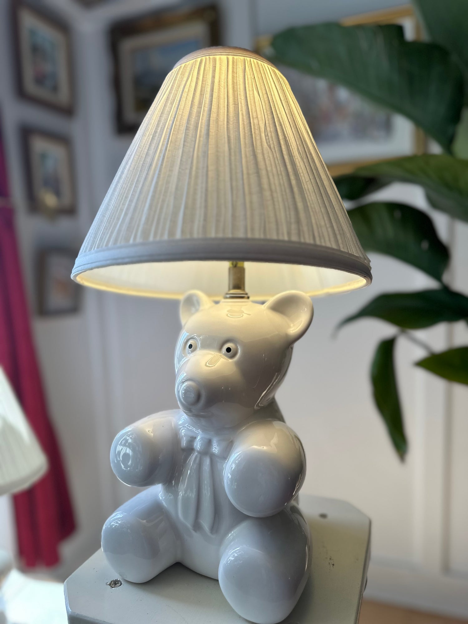This adorable Teddy Bear Vintage Lamp is the perfect addition to any baby or children's room. With its unique teddy bear shaped design and original fabric shade, it adds a soft and soothing ambience light. A charming and functional piece for a cozy and inviting atmosphere.