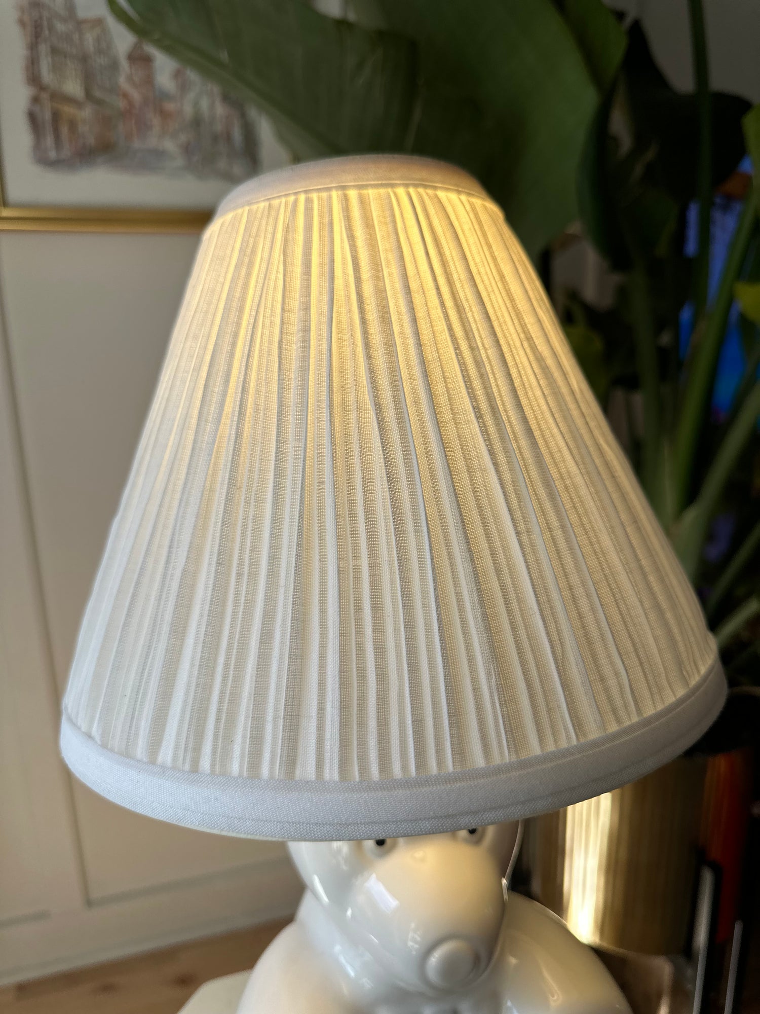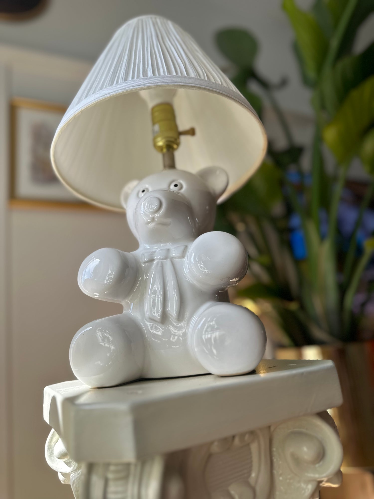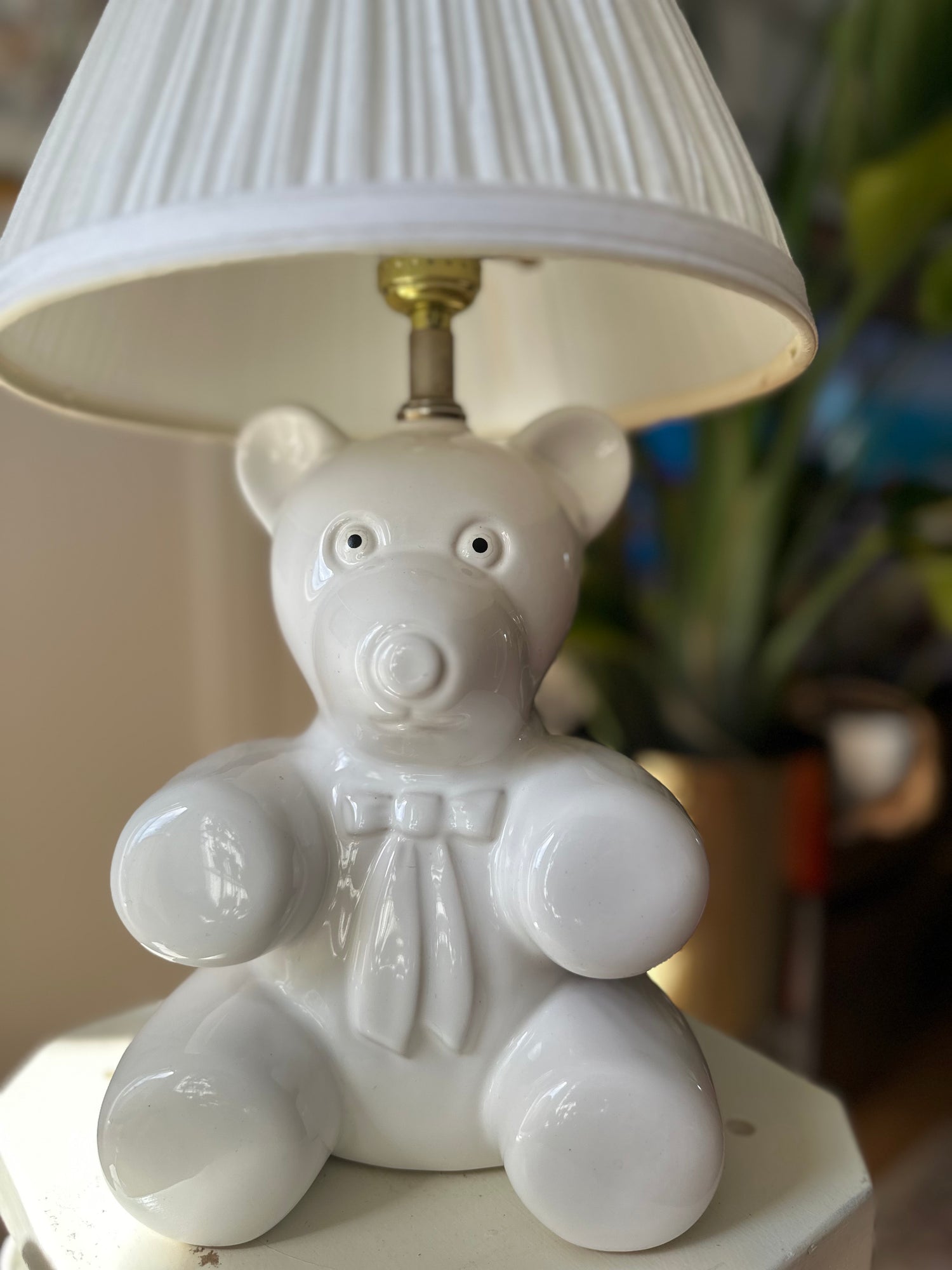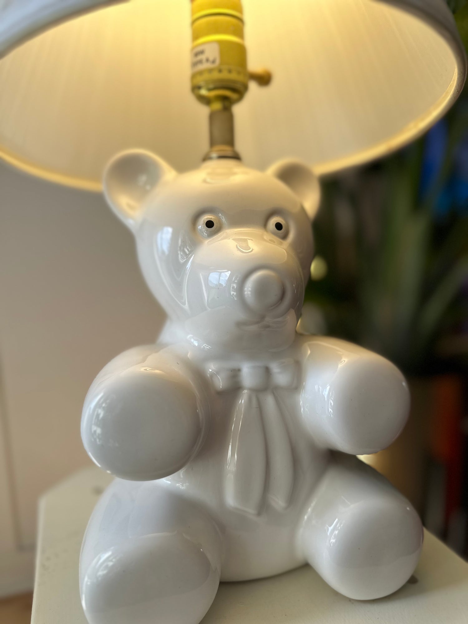 This adorable Teddy Bear Vintage Lamp is the perfect addition to any baby or children's room. With its unique teddy bear shaped design and original fabric shade, it adds a soft and soothing ambience light. A charming and functional piece for a cozy and inviting atmosphere.