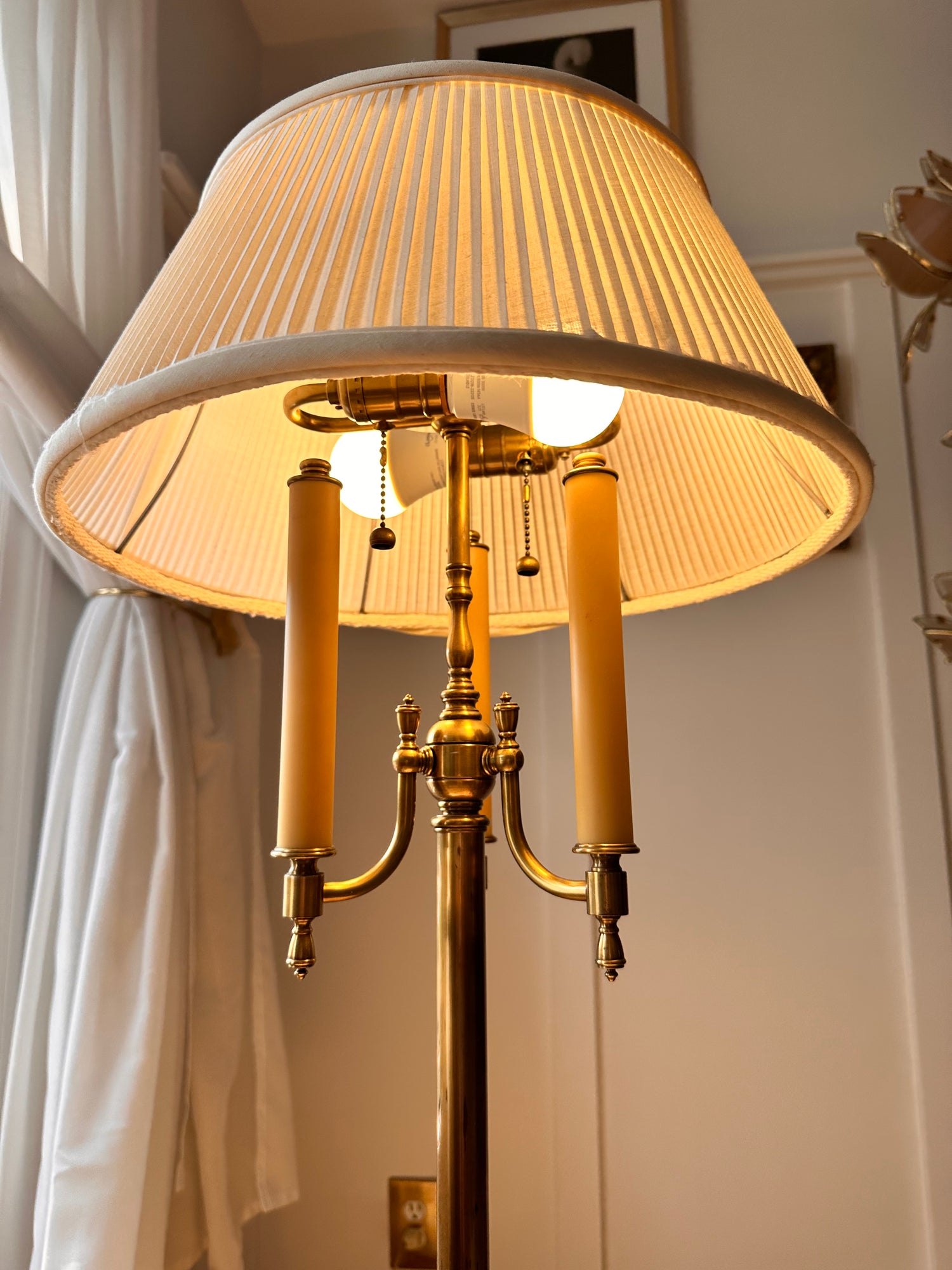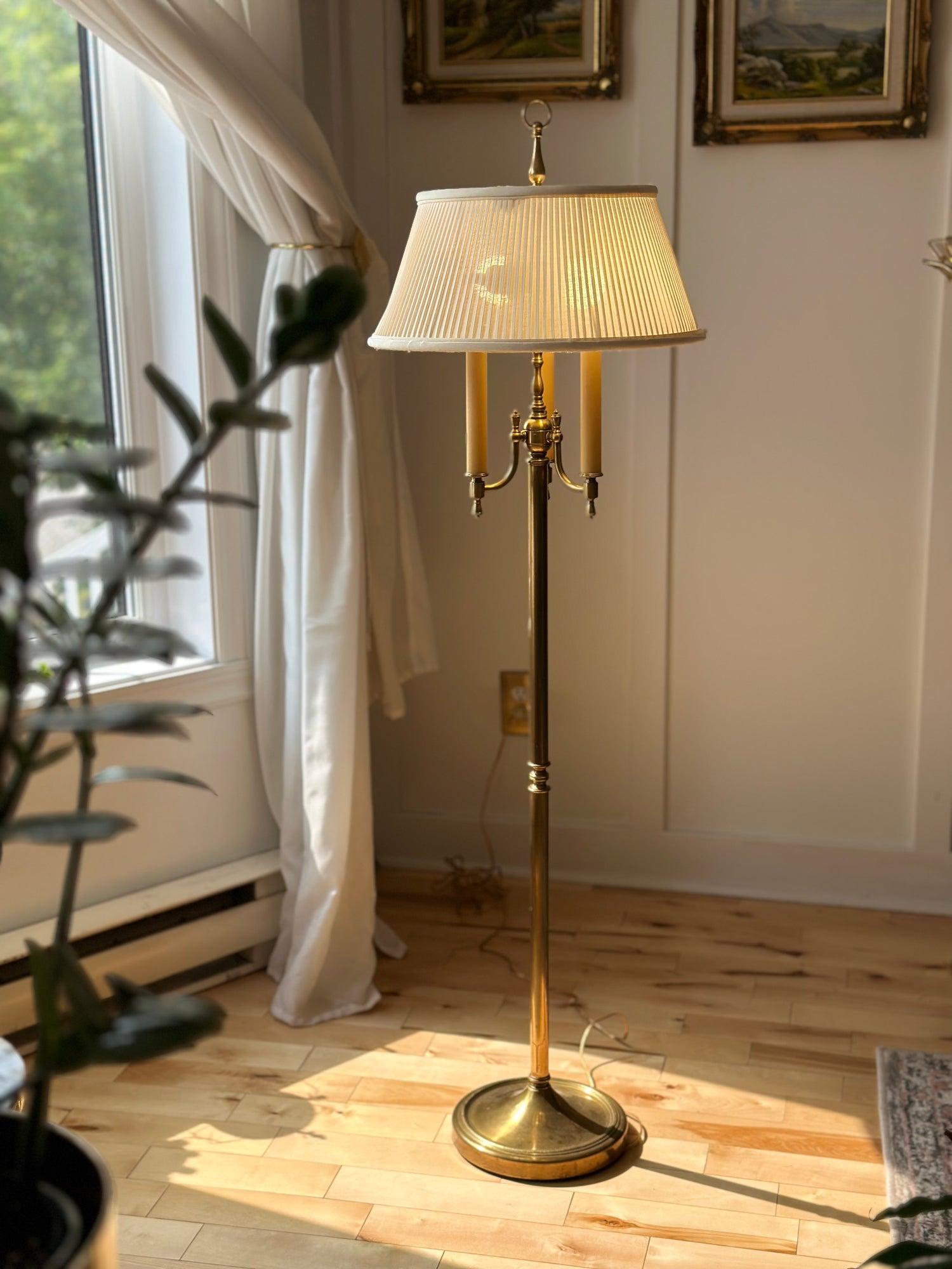 Antique brass floor lamp with original white textile shade. The lamp has 2 LED bulbs (included) that can be turned on/off individually.