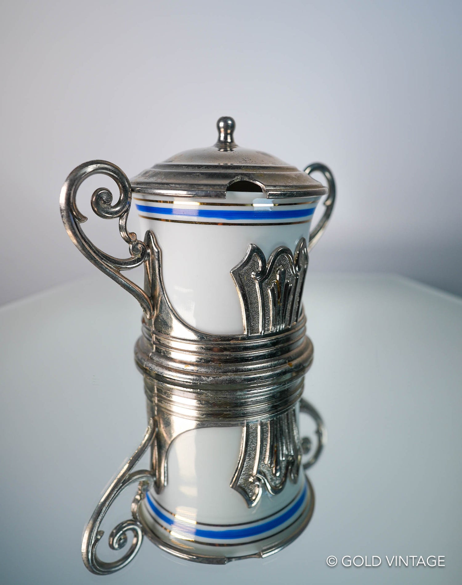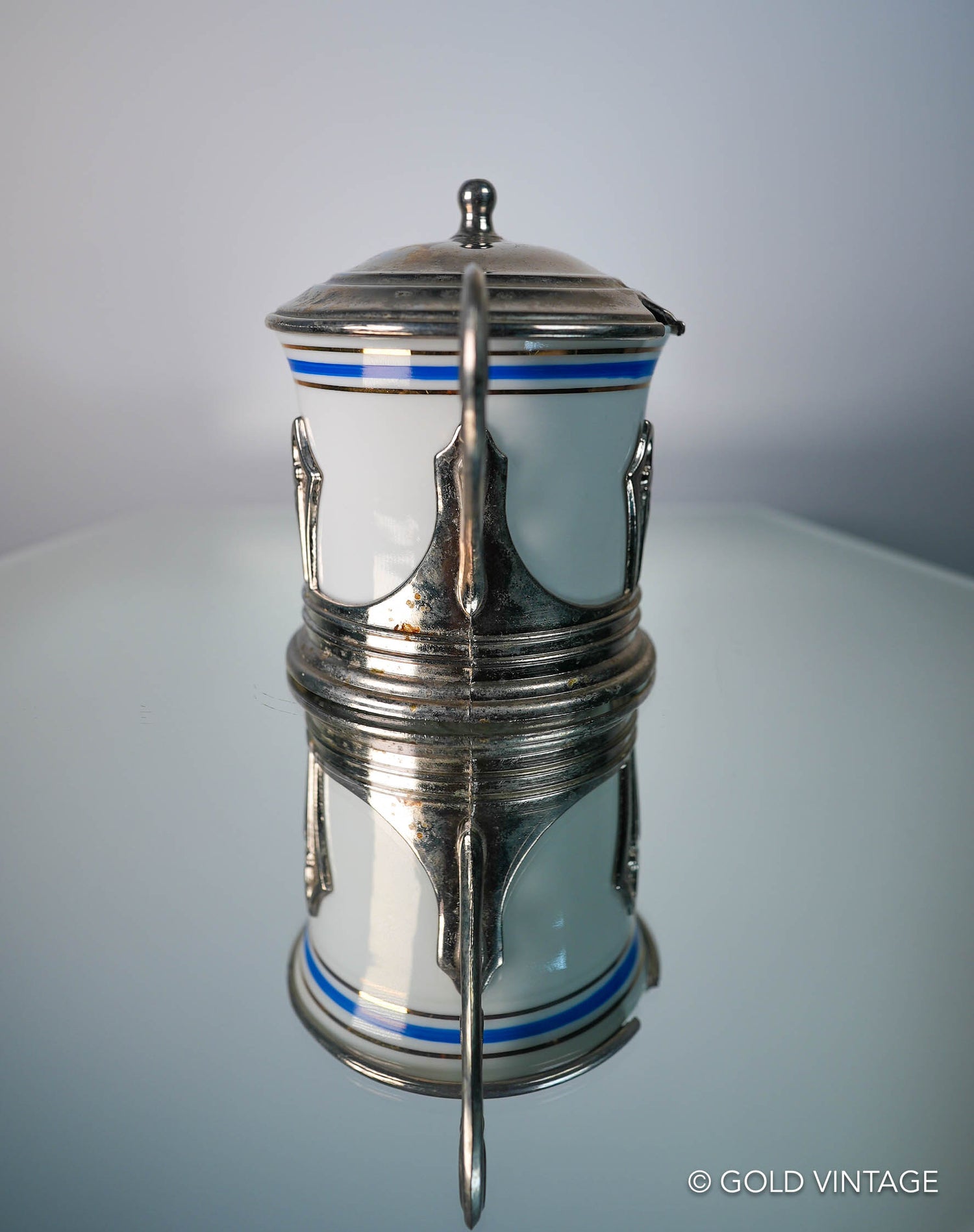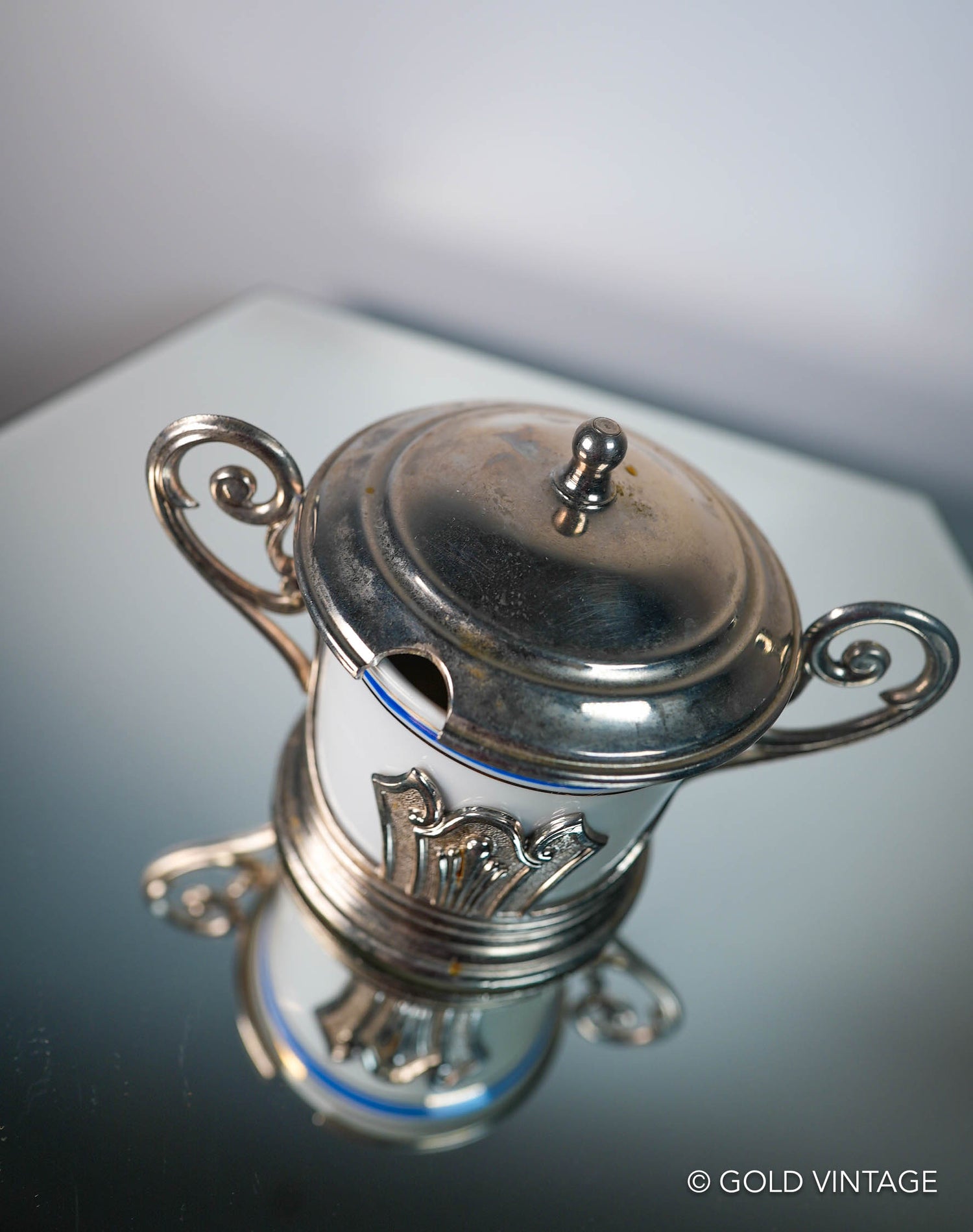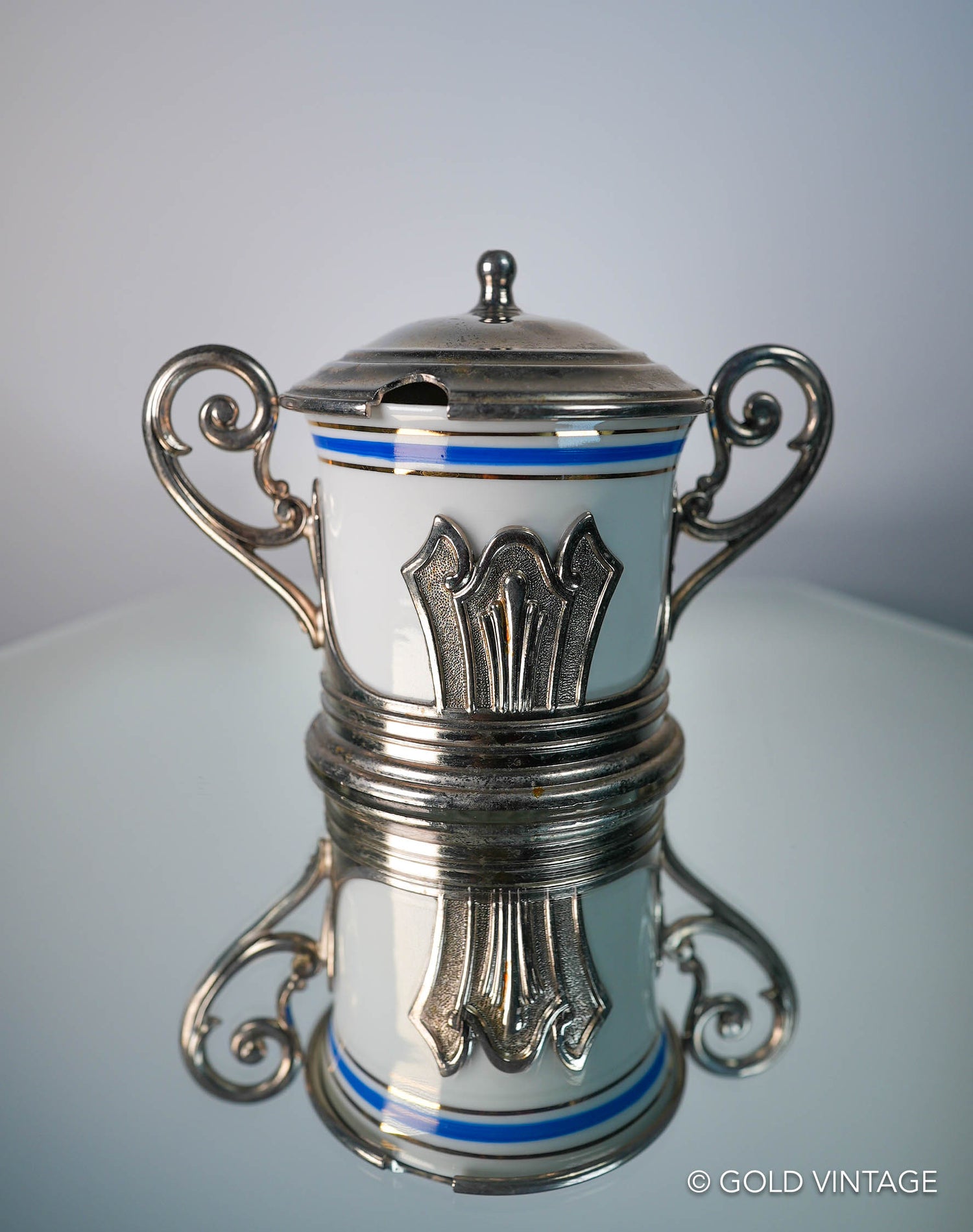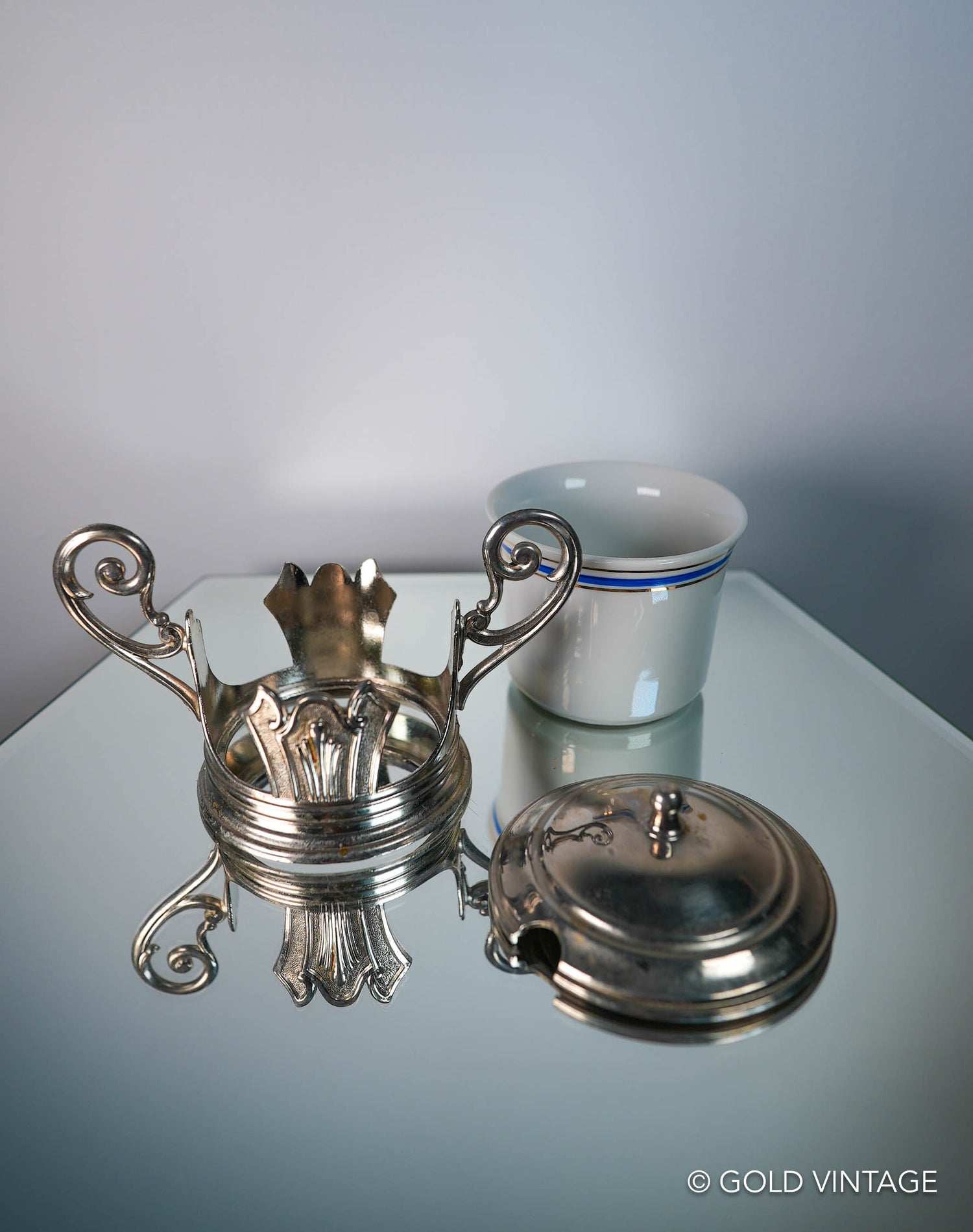 Vintage Italian Chrome & Porcelain Jam Pot Or Sugar Bowl, EP Zinc Chrome Stand Made In Italy, Art Deco Style