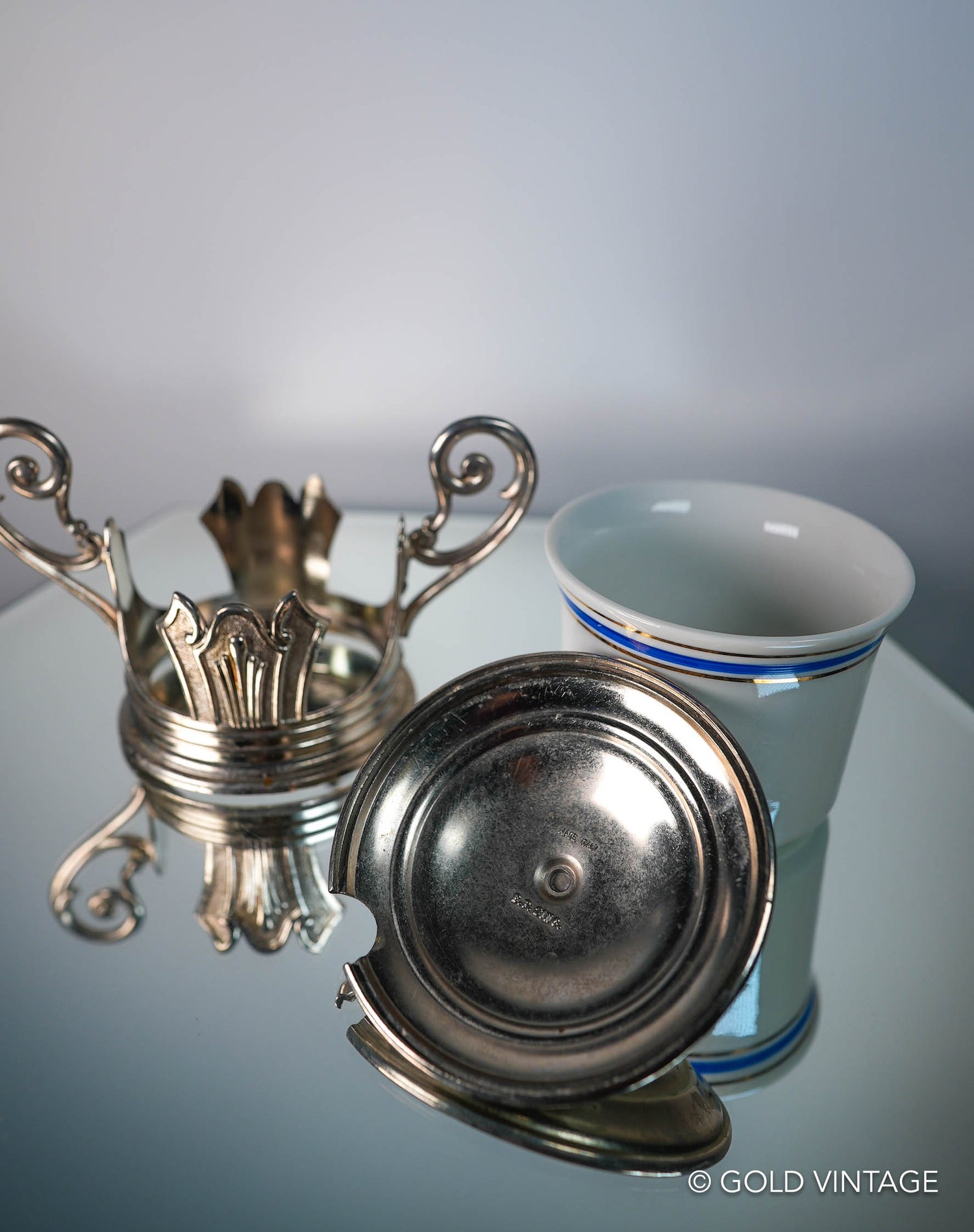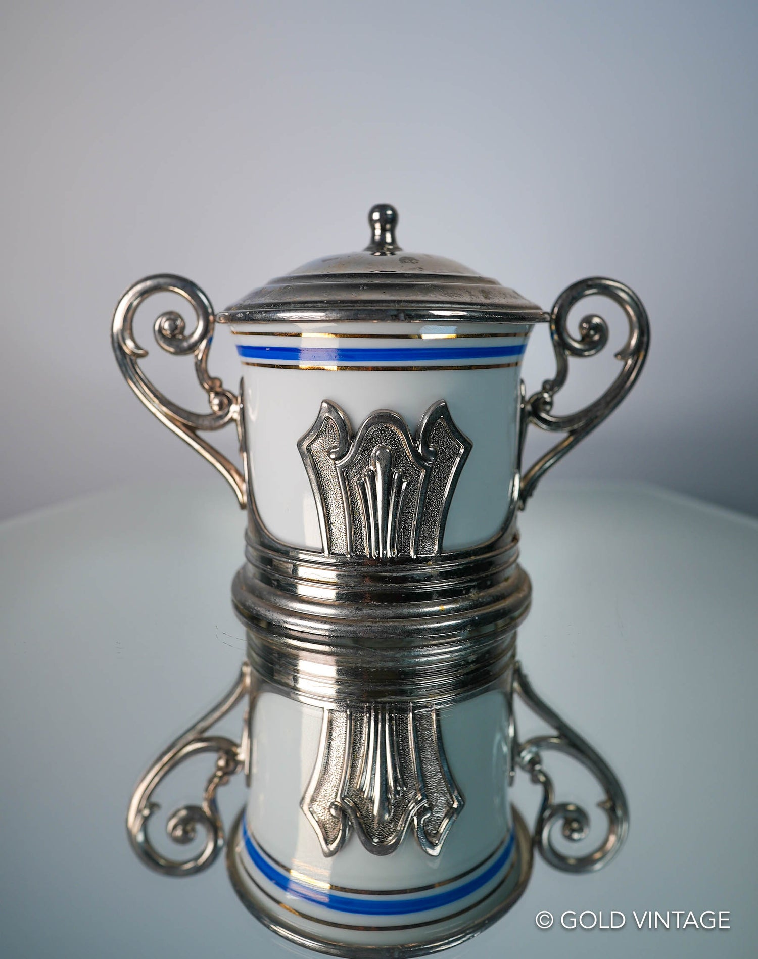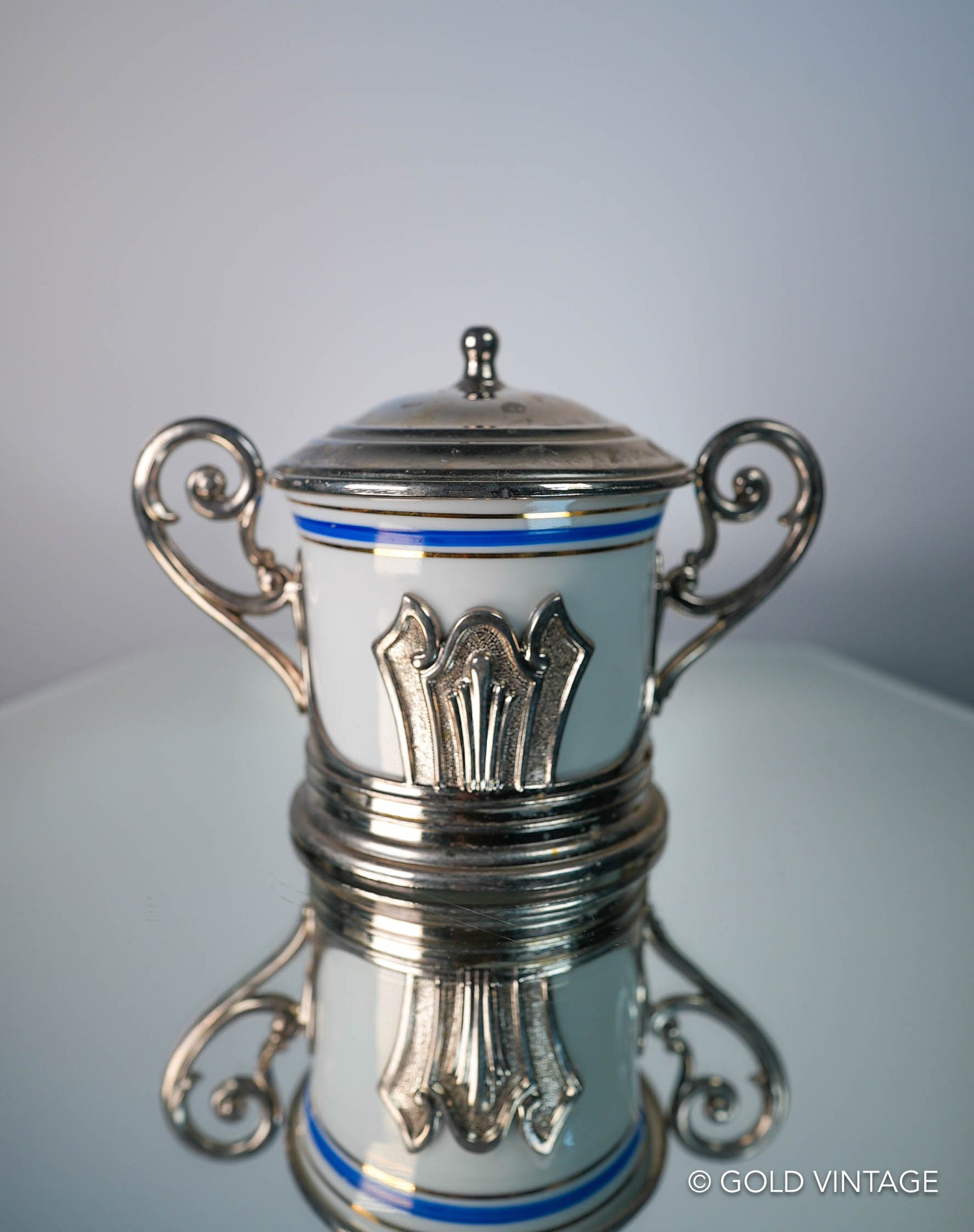 Vintage FP (Fine Porcelain) Zajecar Chrome & Porcelain Jam Pot Or Sugar Bowl, EP Zinc Chrome Stand Made In Italy, Art Deco Style