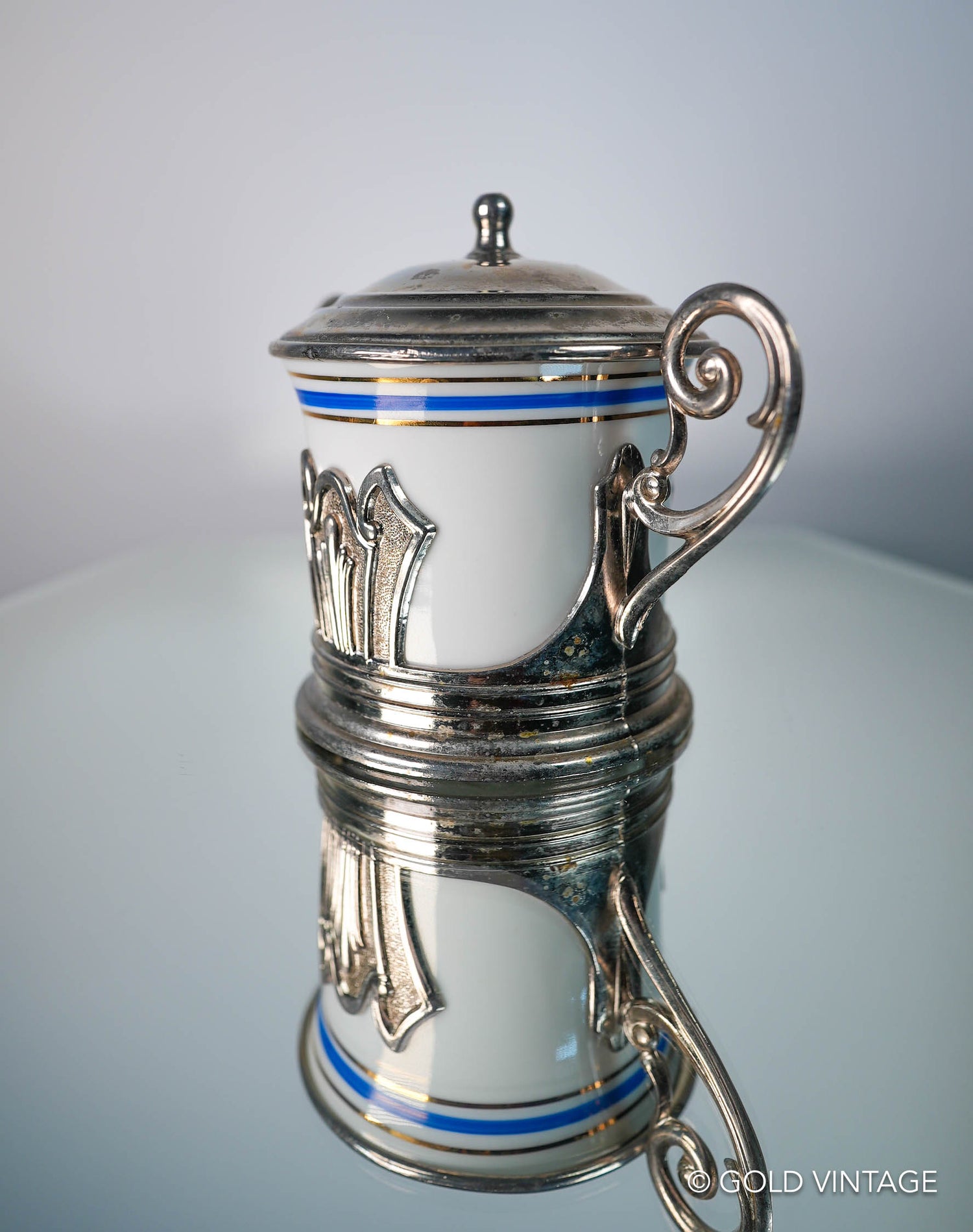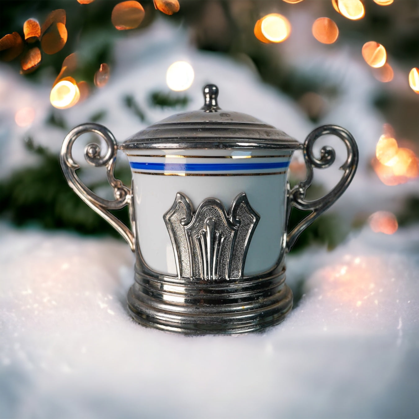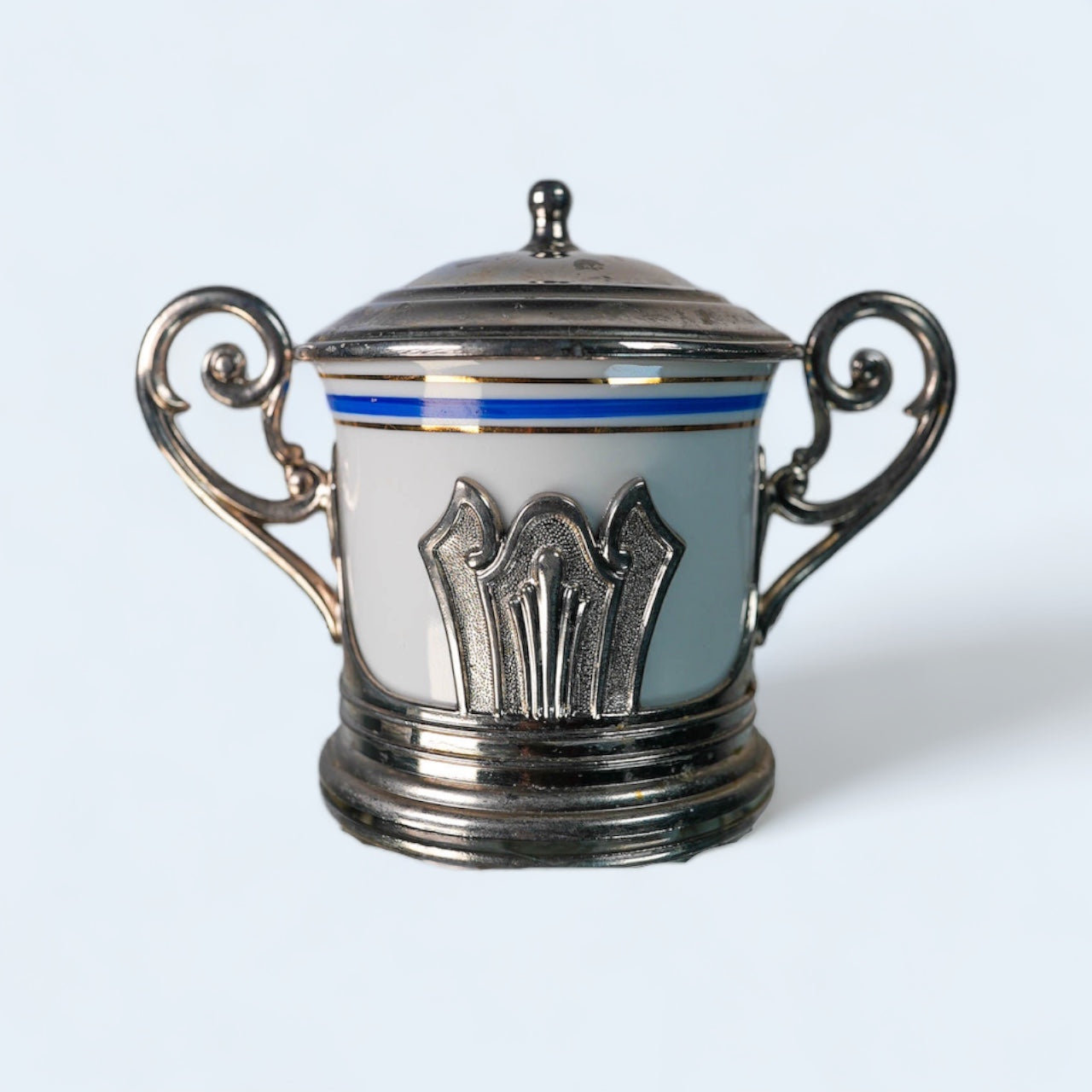 Vintage FP (Fine Porcelain) Zajecar Chrome & Porcelain Jam Pot Or Sugar Bowl, EP Zinc Chrome Stand Made In Italy, Art Deco Style
