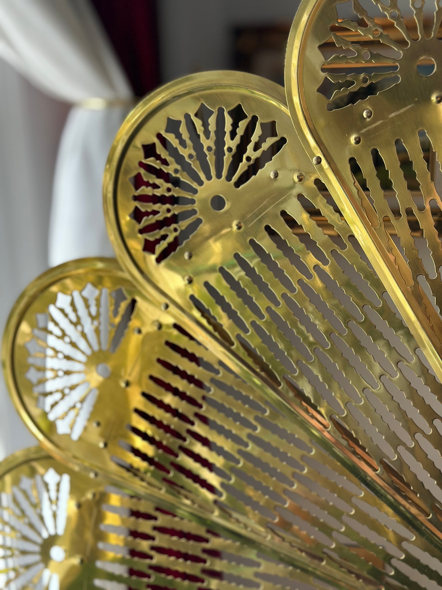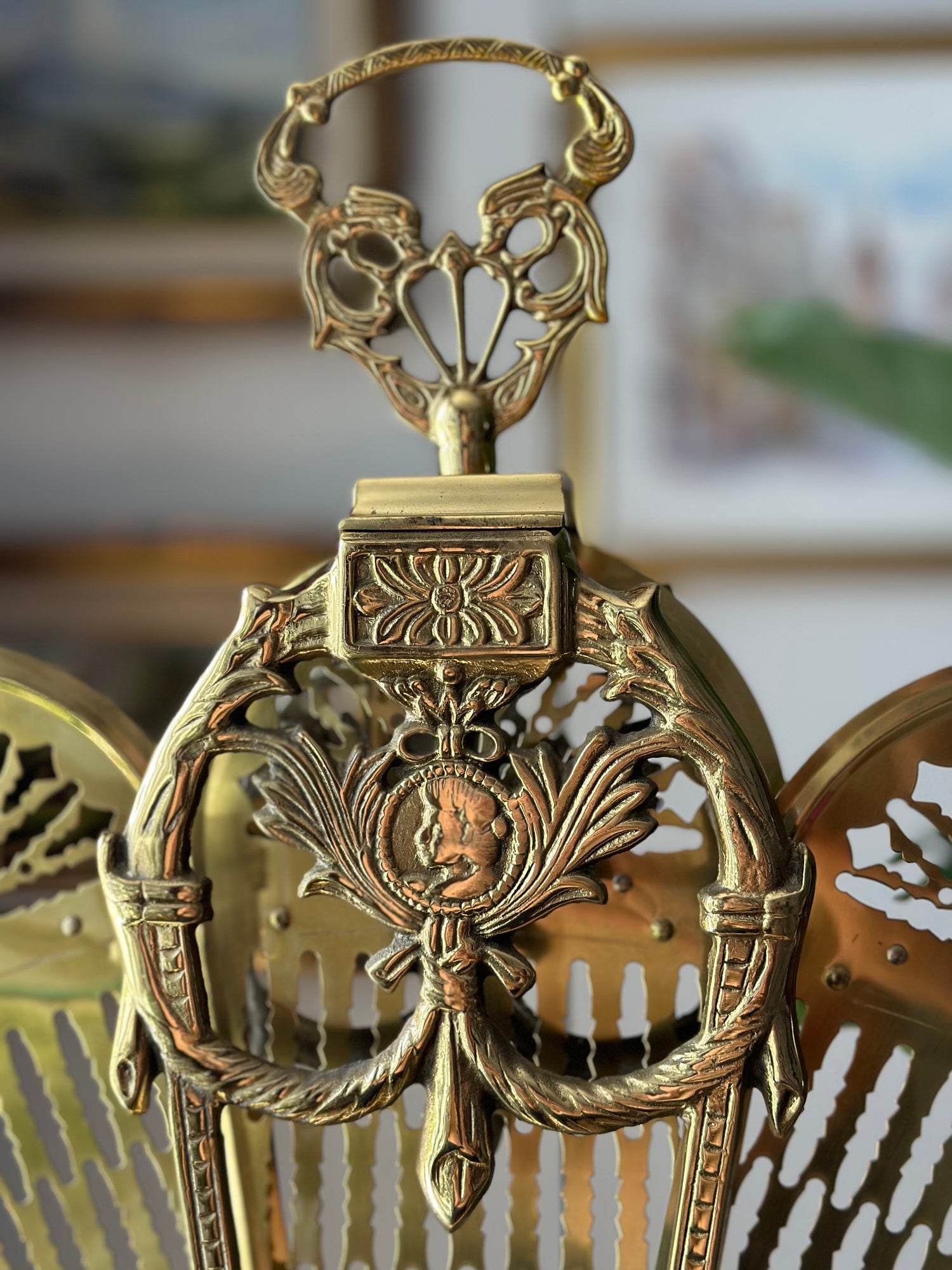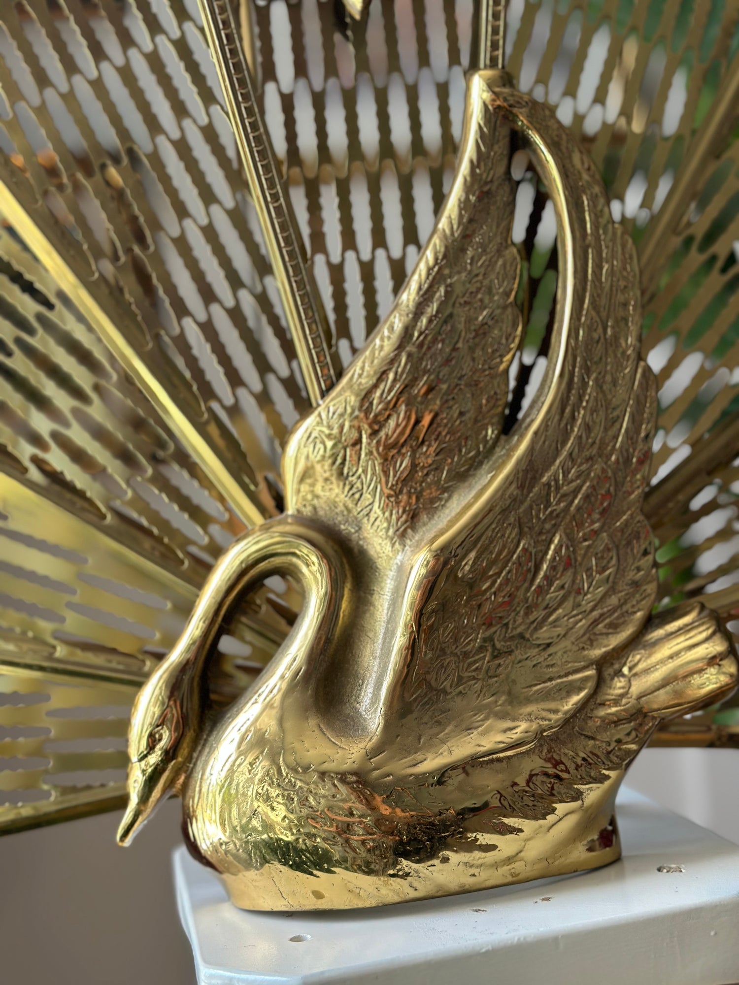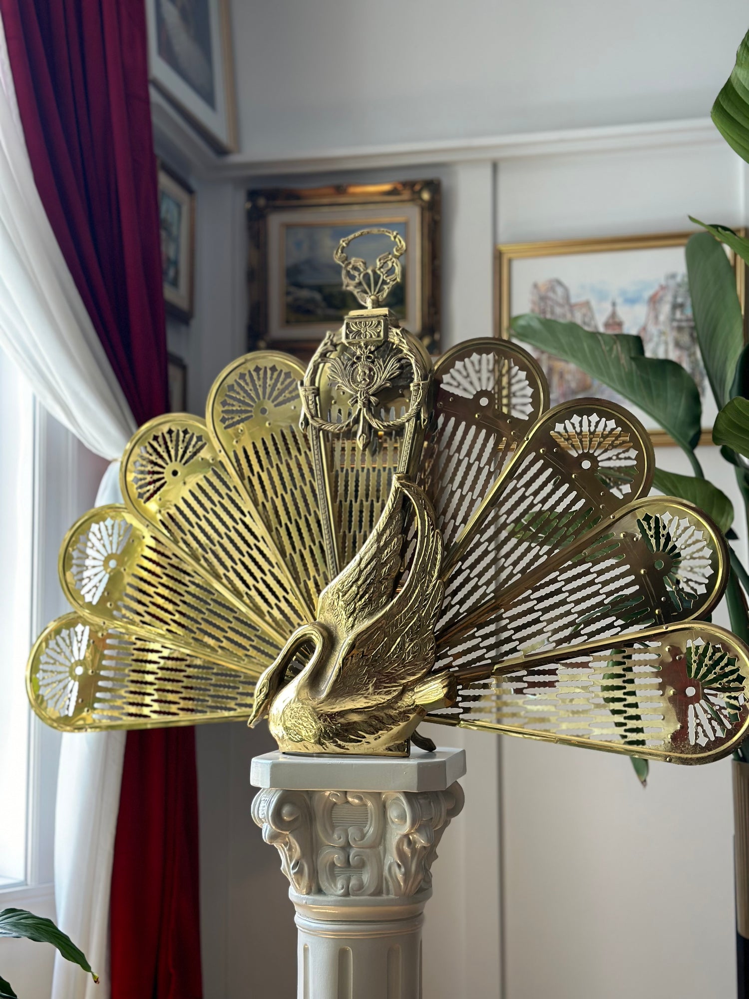 Vintage Swan Themed Brass Peacock Fireplace Fan Folding Screen