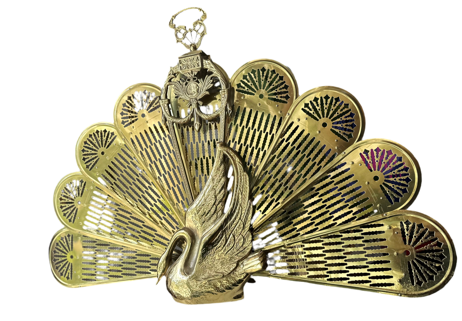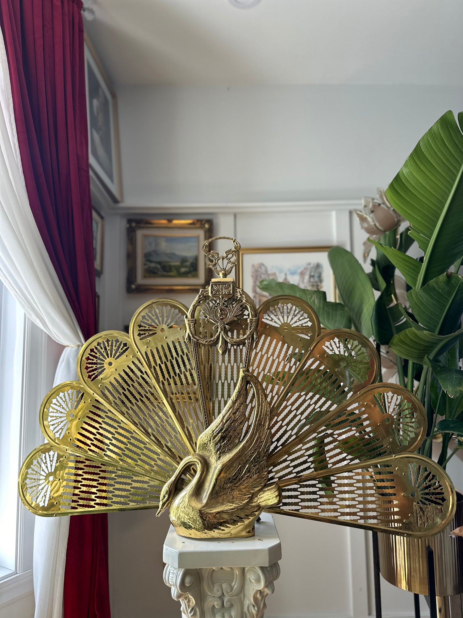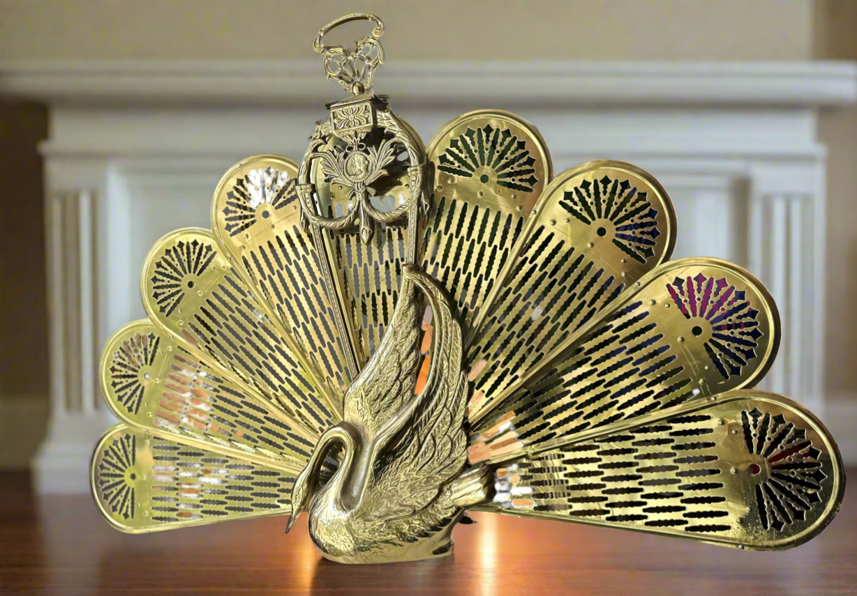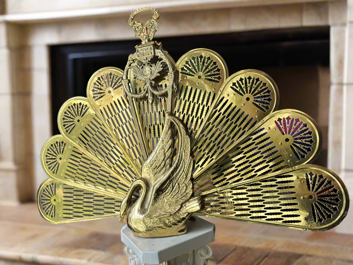 Absolutely stunning French Brass "peacock fan" Full Size fireplace Screen. Lovely when the Fan is Open and yet still very decorative when sitting closed. A Truly Beautiful Piece with an ornate design and is two sided with an antique style Swan shaped mounted on the front with a raised motif. It also is adorned with a handle in the back convenient placement.