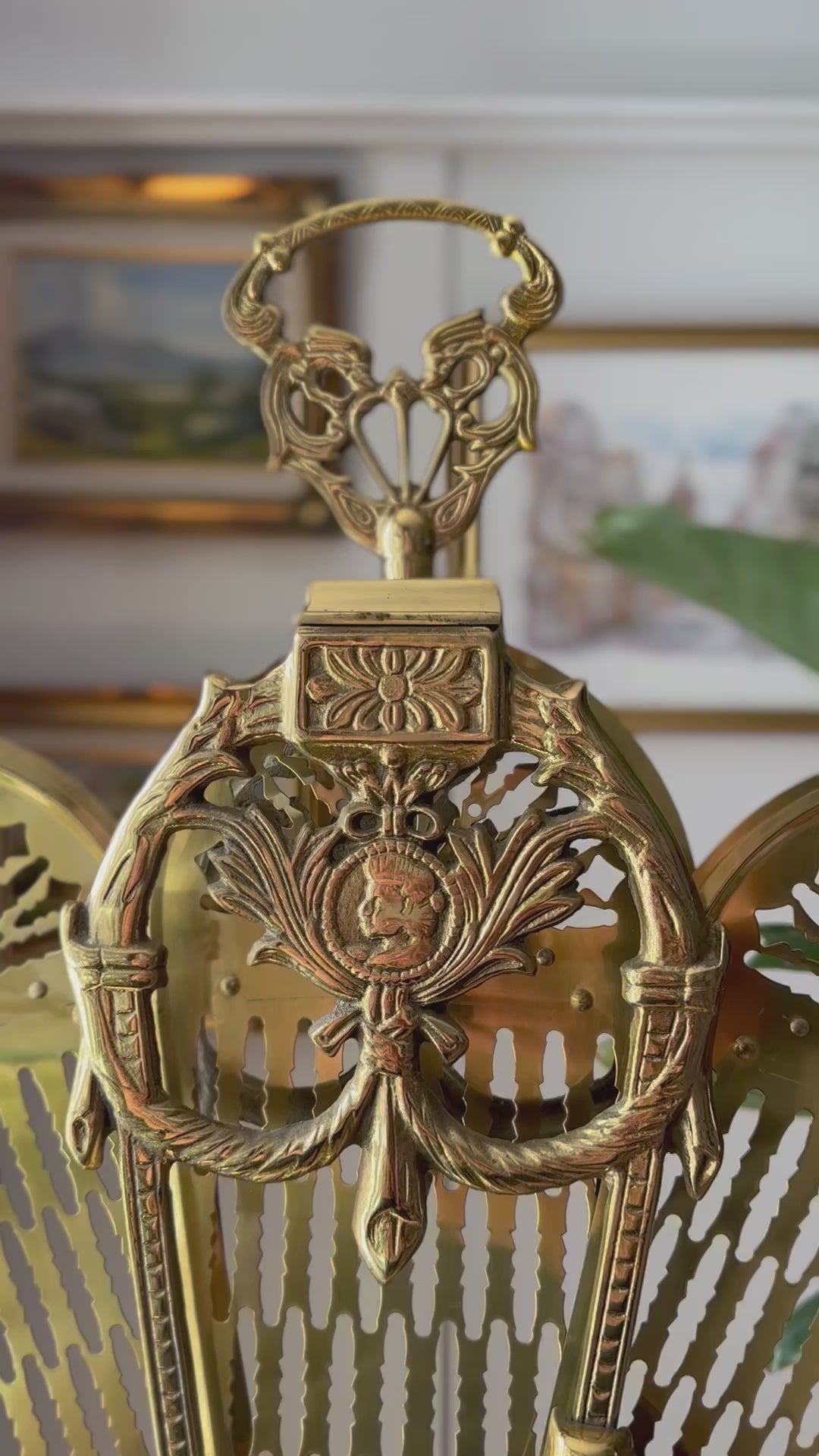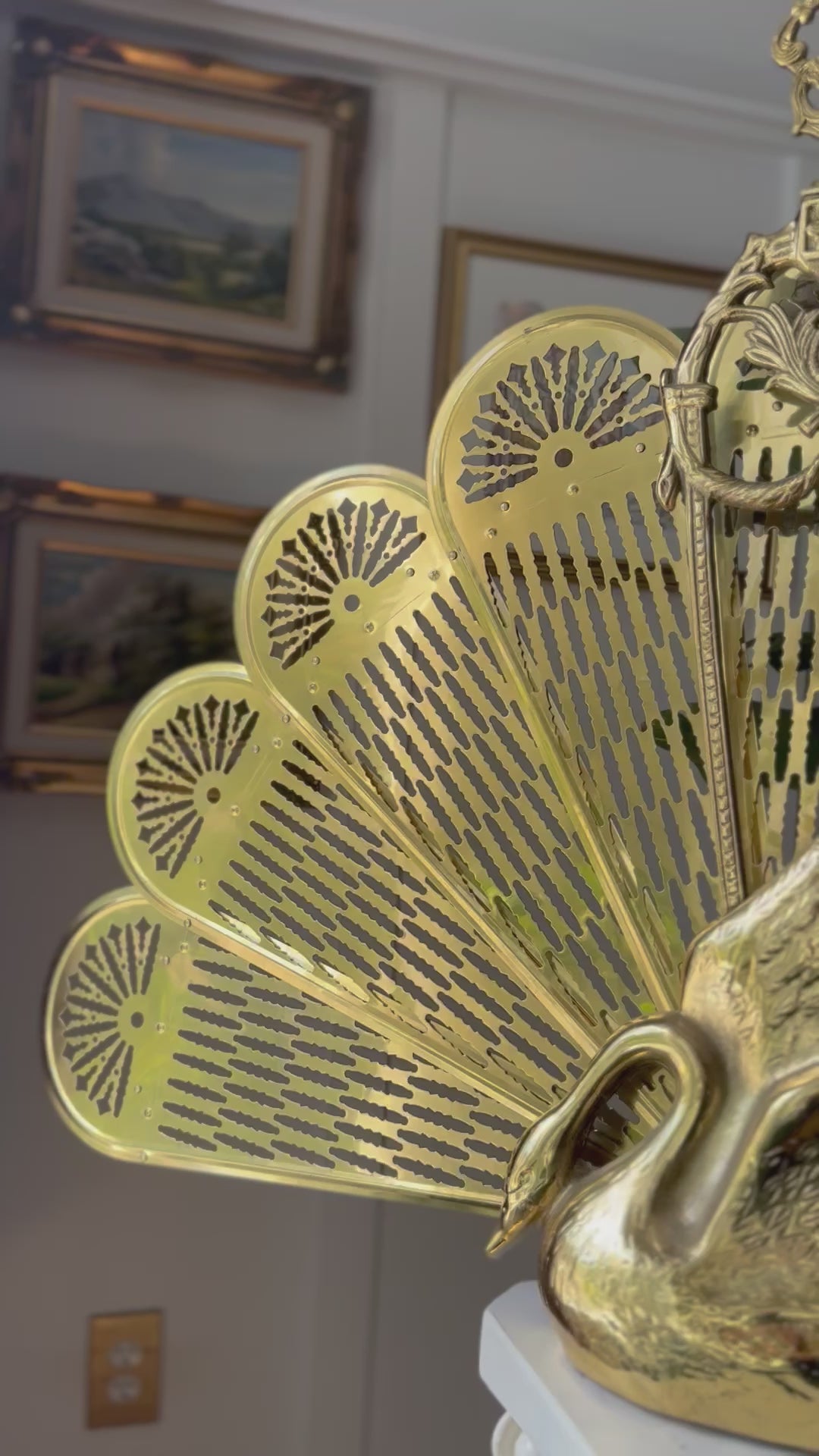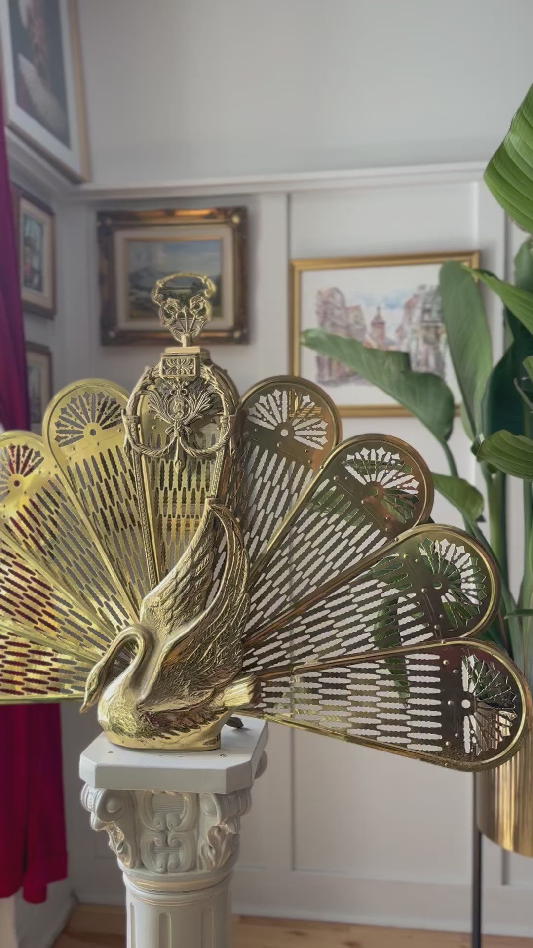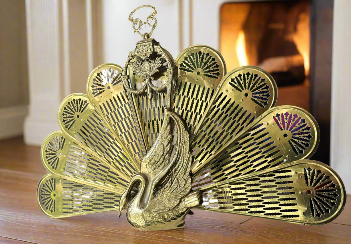 Absolutely stunning French Brass "peacock fan" Full Size fireplace Screen. Lovely when the Fan is Open and yet still very decorative when sitting closed. A Truly Beautiful Piece with an ornate design and is two sided with an antique style Swan shaped mounted on the front with a raised motif. It also is adorned with a handle in the back convenient placement.